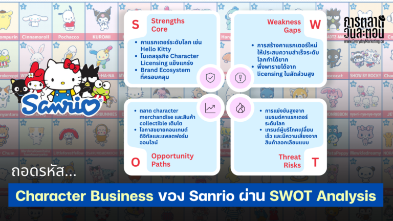 ในช่วงหลายปีที่ผ่านมา อุตสาหกรรมสินค้าคาแรกเตอร์และความบันเทิงเติบโตอย่างต่อเนื่องทั่วโลก ตัวละครจากแอนิเมชัน ภาพยนตร์ หรือสื่อดิจิทัลสามารถต่อยอดไปสู่สินค้าแฟชั่น ของสะสม และประสบการณ์แบรนด์ได้หลากหลายรูปแบบ ทำให้ธุรกิจ Character Business กลายเป็นหนึ่งในตลาดสำคัญของอุตสาหกรรมบันเทิง อย่างไรก็ตาม การสร้างตัวละครที่สามารถครองใจผู้บริโภคทั่วโลกและรักษาความนิยมได้ในระยะยาวไม่ใช่เรื่องง่าย ในบทความนี้ เบลล์จะพาทุกคนมาวิเคราะห์ความสำเร็จของ Sanrio Company Ltd. ผ่านเครื่องมือ SWOT Analysis เพื่อทำความเข้าใจจุดแข็ง จุดอ่อน โอกาส และความท้าทายของธุรกิจ ก่อนจะสรุปเป็น Strategic Insight เพื่อมองแนวทางการเติบโตของบริษัทในอนาคตค่ะ ทำความรู้จักกับ Sanrio บริษัทผู้สร้างตัวละครที่ครองใจคนทั่วโลก Sanrio Company Ltd. ก่อตั้งขึ้นในปี 1960 โดย Shintaro Tsuji ที่ประเทศญี่ปุ่น โดยเริ่มต้นจากธุรกิจเล็ก ๆ ที่จำหน่ายสินค้าเกี่ยวกับของขวัญและเครื่องเขียน โดยแนวคิดหลักของบริษัทคือการสร้างความสุขเล็ก ๆ ให้กับผู้คนผ่านสินค้าและตัวละครที่มีความน่ารัก หรือแนวคิดที่เรียกว่า “Small Gift, Big Smile” ซึ่งกลายเป็นสโลแกนสำคัญของแบรนด์ และจุดเปลี่ยนสำคัญของบริษัทเกิดขึ้นในปี 1974 […]