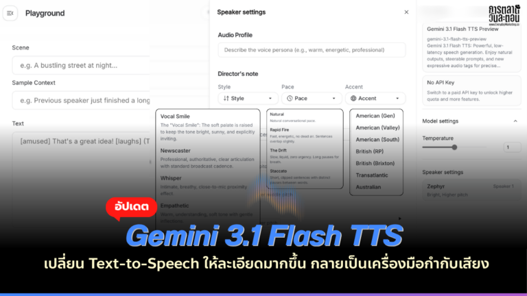 ก่อนหน้านี้เวลาเราพูดถึง Text-to-Speech หลายคนจะนึกถึงเครื่องมือที่เอาข้อความมาแปลงเป็นเสียง แต่สิ่งที่ Google กำลังทำกับ Gemini 3.1 Flash TTS ดูจะไปไกลกว่านั้น สิ่งที่เปลี่ยนไปไม่ใช่แค่คุณภาพเสียง แต่เป็นวิธีคิดของการสร้างเสียงทั้งหมด จากเดิมที่เราแค่พิมพ์ข้อความแล้วรอระบบพูดออกมา กำลังกลายเป็นกระบวนการที่มีทั้งฉาก บริบท ตัวละคร จังหวะ สำเนียง และการกำกับอารมณ์อยู่ในนั้นด้วย บทความนี้เลยจะพามา อัพเดท Gemini 3.1 Flash TTS กับ Text-to-Speech ที่ละเอียดมากขึ้นครับ ถ้ามองแบบคนทำคอนเทนต์ นี่ไม่ใช่แค่อัปเดตฟีเจอร์เล็ก ๆ แต่คือสัญญาณว่า AI เสียงกำลังขยับจากหมวด utility tool ไปสู่ creative production tool มากขึ้นเรื่อย ๆ และนั่นทำให้ Gemini 3.1 Flash TTS น่าสนใจมากเป็นพิเศษ เพราะมันไม่ได้แข่งกันแค่ว่าเหมือนเสียงมนุษย์มากแค่ไหน แต่แข่งกันที่คำว่าเราสามรถคุมเสียงนั้นได้ลึกแค่ไหนต่างหากครับ Gemini 3.1 Flash TTS […]