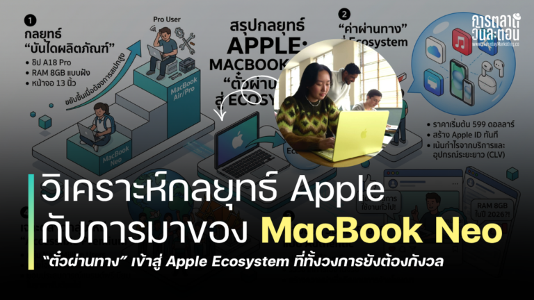 ถ้าพูดถึงแบรนด์ที่มีโลโก้แอปเปิลแหว่ง ภาพแรกที่โผล่มาในหัวของหลายคนคงหนีไม่พ้นภาพลักษณ์ที่ดูพรีเมียม ดีไซน์หรูหรา และแน่นอนครับ… ราคาที่ต้องคิดแล้วคิดอีก หากเราลอง วิเคราะห์กลยุทธ์ Apple ที่ผ่านมา ต้องบอกว่าแบรนด์มีการวางตำแหน่งที่อาจจะเรียกได้ว่าอยู่บนยอดพีระมิดของอุตสาหกรรมคอมพิวเตอร์เลยก็ว่าได้ แต่การมาของ MacBook Neo ด้วยราคาเริ่มต้นเพียง 599 ดอลลาร์ (ราคาไทยเริ่มต้นที่ 19,900 บาท) ถือเป็นการสร้างแรงสั่นสะเทือนไปทั้งวงการเลยก็ว่าได้ และคงมีหลายคนที่อาจจะสงสัยว่า Apple กำลังยอมเปลี่ยนแนวทางเพื่อสร้างยอดขายในยุคเศรษฐกิจปัจจุบันหรือเปล่า? การทำแบบนี้จะทำให้เกิด Brand Dilution ไหม? แต่ถ้าหากเราถอยออกมามองภาพใหญ่ นี่ไม่ใช่การลดเกรดแบรนด์ครับ แต่มันคือการ “จัดโครงสร้างพอร์ตโฟลิโอใหม่” (Portfolio Architecture) ที่น่าสนใจมาก เป็นการใช้โปรดักต์ชิ้นเดียวมาทำหน้าที่เป็น “บันไดขั้นแรก” เพื่อเปิดประตูรับลูกค้านับล้านคนให้เดินเข้ามาใน Ecosystem ของตัวเองอย่างเต็มใจ ลองมาเจาะลึกกันทีละประเด็นครับว่า Apple วางหมากครั้งนี้ไว้อย่างไรบ้าง Product Ladder ศิลปะการสร้าง “บันได” และจิตวิทยาแห่งการกั๊กสเปก เวลาที่แบรนด์ระดับบนอยากขยายฐานลูกค้าลงมาเล่นตลาดที่กว้างขึ้น ปัญหาคลาสสิกที่มักจะเจอคือภาวะ Cannibalization หรือการที่สินค้าตัวเริ่มต้นดันไปแย่งยอดขายสินค้าเรือธงของตัวเอง หลายแบรนด์พลาดเพราะพยายามทำรุ่นเริ่มต้นให้สเปกสูงเกินไป จนลูกค้าไม่เห็นความจำเป็นที่จะต้องซื้อรุ่นที่ราคาสูงกว่าครับ แต่ Apple […]