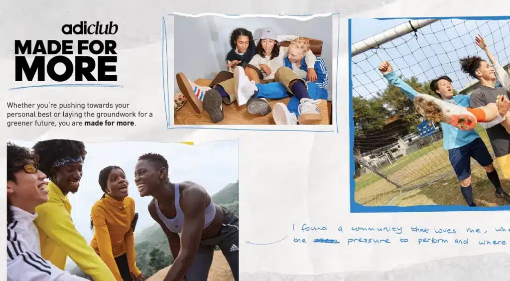 Adidas มีระบบสมาชิกอย่าง Adiclub ที่ก็สามารถสะสมแต้มหรือคะแนน เพื่อนำไปแลกส่วนลดพิเศษได้เช่นกัน แต่เป็นแค่เพียงส่วนหนึ่งเท่านั้น เพราะระบบสมาชิกของ Adidas ต้องการที่จะส่งมอบประสบการณ์ที่ดีผ่าน Customer Journey ของลูกค้า แบรนด์ได้ใช้ระบบ Adiclub ให้กลายเป็นเหมือน Community แห่งหนึ่งที่จะคอยสนับสนุน Lifestyle ของผู้ที่เป็นสมาชิกให้ได้ทำกิจกรรมต่าง ๆ ที่เหมาะกับตัวเอง