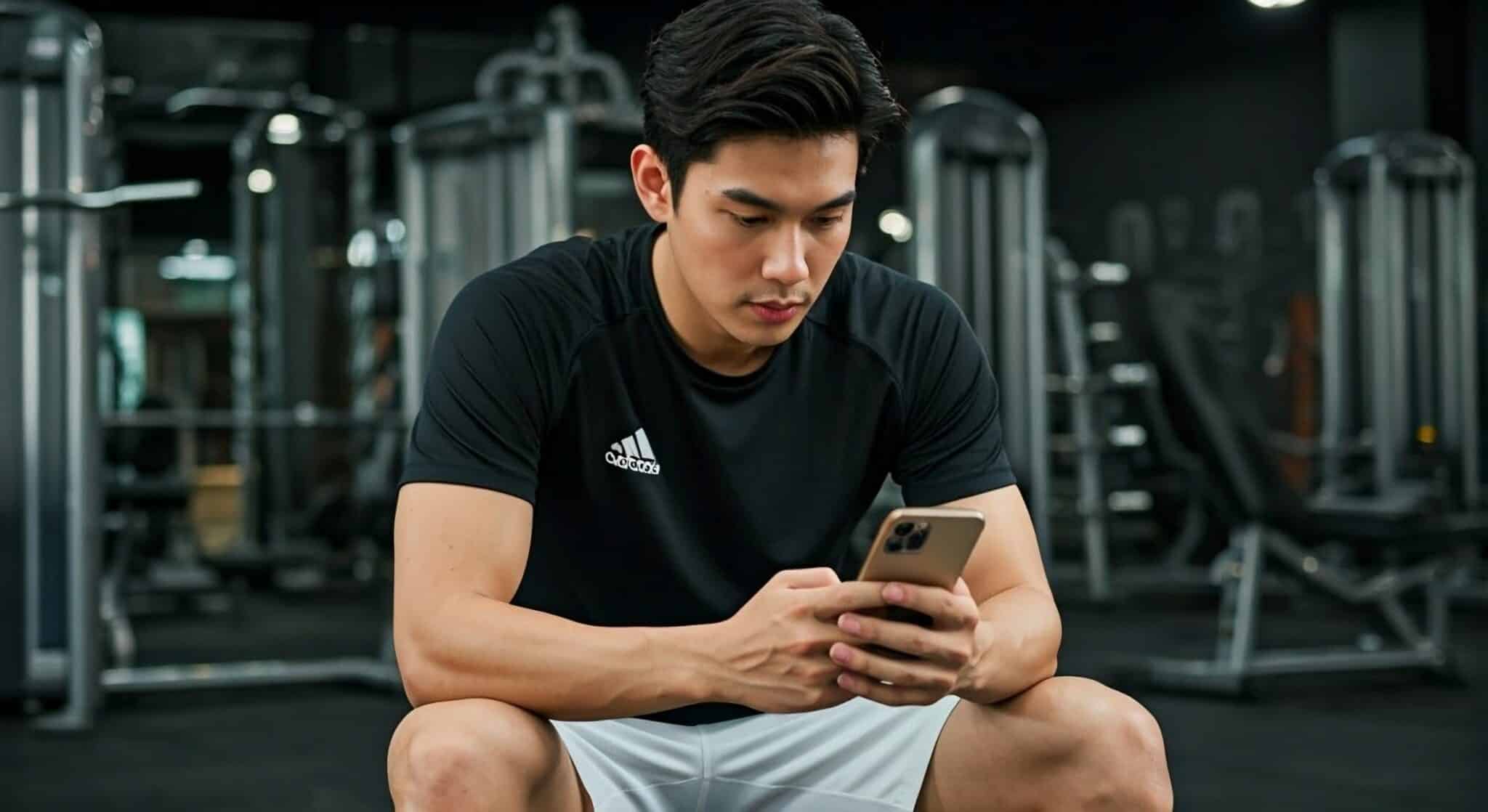 AI-Generated Image by Shutterstock (Prompt: A handsome Thai man wearing a black Adidas workout shirt and white shorts, sitting on a chair in a gym surrounded by fitness equipment. He is holding an iPhone 15 Natural Titanium in one hand and scrolling through it to shop with the other hand. The photo is taken from a front angle in a Documentary Photography style.)