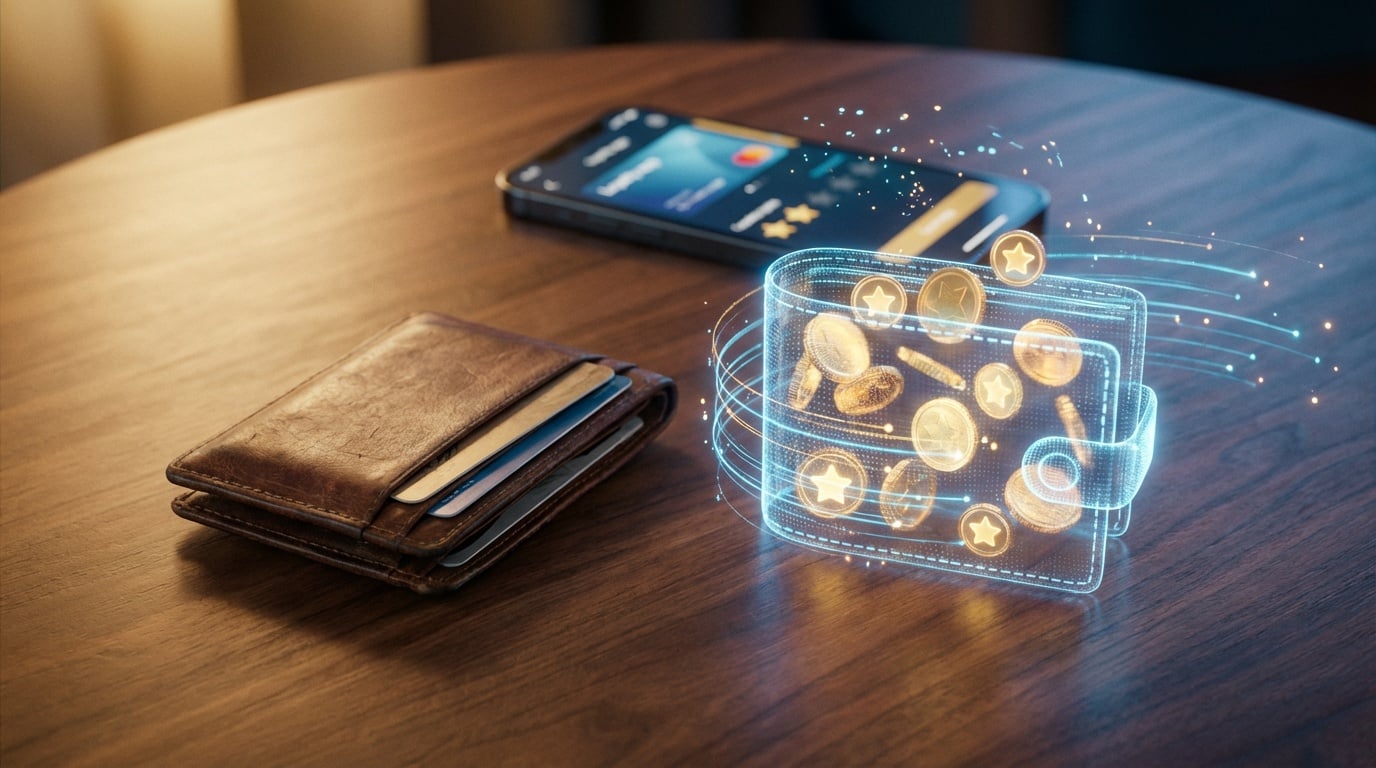 AI-Generated by Shutterstock (Prompt: A cinematic, photorealistic conceptual image depicting the transformation of loyalty points into value. On a sleek wooden table, a classic brown leather wallet sits on the left. Next to it on the right, a glowing, futuristic digital wallet is materializing, formed by floating golden coins, star icons, and digital data streams. A smartphone in the background displays a loyalty app interface with particles flowing into the digital wallet. Warm and blue lighting, shallow depth of field, high detail, 8k resolution, financial technology theme, no text overlay, –ar 16:9)