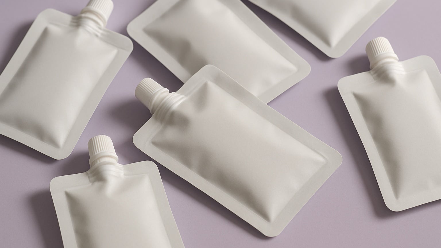 AI-Generated by Shutterstock (Prompt: A digital photograph of several blank white flexible matte cosmetic sachets with glossy ridged screw-on caps. The sachets are lying flat on a smooth surface, arranged neatly with some slight overlaps. The background is soft purple to create contrast. The sachets are completely plain, with no logo or text. Lighting is soft and natural, highlighting the folds and edges for a clean, minimalist, and modern look.)