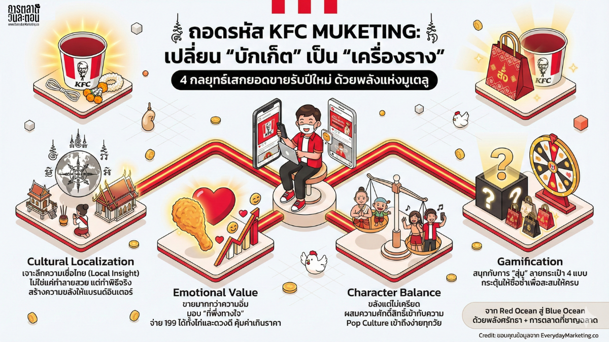 ในยุคที่การแข่งขันของธุรกิจ Quick Service Restaurant ร้อนแรงจนปรอทแตก การลดแลกแจกแถมแบบเดิม ๆ อาจไม่เพียงพอที่จะดึงดูดผู้บริโภคได้อีกต่อไปครับ โดยเฉพาะในช่วงเทศกาลปีใหม่ที่เป็น Red Ocean ของทุกแบรนด์ บทความนี้พามาดู การตลาด KFC ทำ MUKETING ฉีกตำราการตลาดอาหารแบบเดิม ด้วยแคมเปญที่เล่นใหญ่และลึกซึ้งกว่าแค่การแจกของพรีเมียม การตลาดวันละตอนจะพามาถอดรหัส 4 กลยุทธ์เบื้องหลังแคมเปญนี้กันครับ