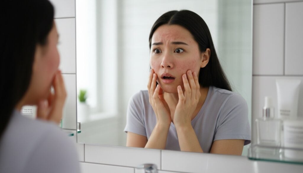 ขอบคุณภาพจาก Shutterstock AI Generator Prompt : A realistic photo of a young Asian woman in her late 20s standing in front of a bathroom mirror, looking shocked and distressed at her skin. Her face shows visible signs of skin irritation such as redness, acne, dryness, and uneven texture. She gently touches her cheeks with both hands, eyes widened in concern. Soft natural lighting, clean bathroom background, skincare products slightly blurred. The mood conveys anxiety, lack of confidence, and frustration caused by damaged sensitive skin. High realism, emotional expression, natural skin texture, lifestyle photography.