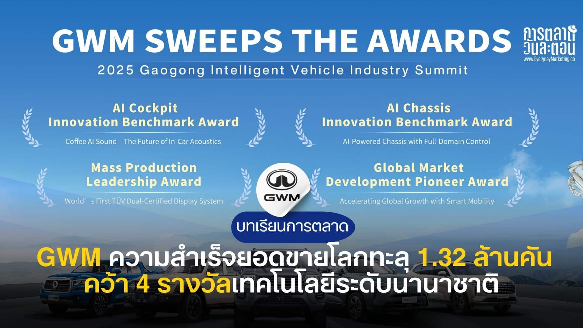 ตอนนี้วงการรถยนต์หมุนไวมากจริง ๆ ค่ะ ทั้งเรื่องเทคโนโลยีสุดล้ำและพลังงานสะอาดที่เข้ามาเปลี่ยนการขับขี่ของเราไปอย่างสิ้นเชิงซึ่งถ้าพูดถึงแบรนด์ที่กำลังมาแรงและน่าจับตามองคงหนีไม่พ้น GWM ค่ะ เพราะพิสูจน์ให้เราเห็นแล้วว่าแบรนด์รถยนต์สัญชาติจีนไม่ได้เป็นแค่ผู้ตามในตลาดอีกต่อไปแต่กำลังก้าวขึ้นมาเป็นผู้นำระดับโลก ความสำเร็จของ GWM ในปี 2568 ที่ผ่านมา ถือเป็นปีทองที่น่าประทับใจค่ะ นอกจากจะมียอดขายถล่มทลายจนทะลุเป้าที่ตั้งไว้แล้ว ยังโชว์ศักยภาพด้วยการกวาดรางวัลระดับนานาชาติมาครองได้ถึง 4 รางวัลจากงานใหญ่ที่เซี่ยงไฮ้อย่าง Gaogong Intelligent Vehicle Industry Summit อีกด้วย ซึ่งรางวัลเหล่านี้เป็นเครื่องยืนยันถึงความล้ำสมัยของเทคโนโลยีอัจฉริยะที่ตั้งใจพัฒนามาอย่างต่อเนื่อง ในบทความนี้เรามาถอด บทเรียนการตลาด GWM ไปพร้อม ๆ กันค่ะว่าอะไรคือเคล็ดลับที่ทำให้ GWM ประสบความสำเร็จขนาดนี้