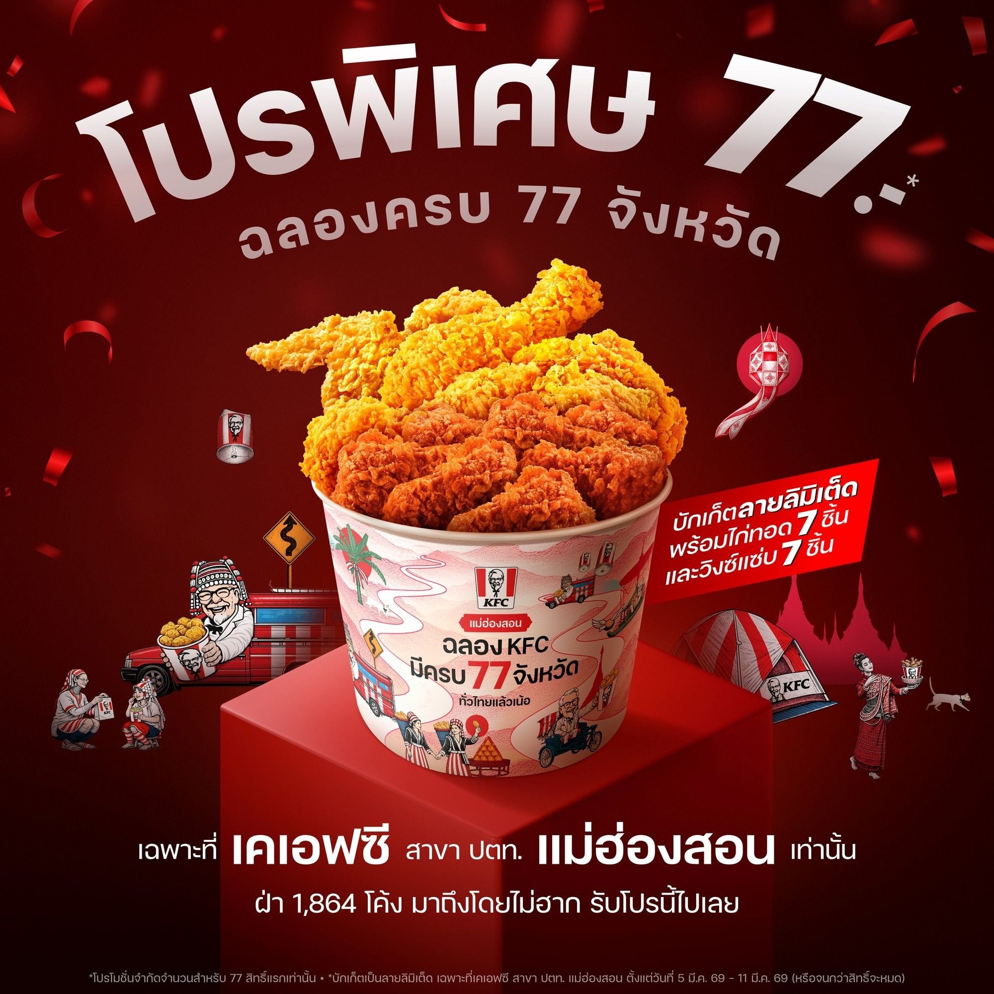 เมื่อเดินทางมาถึงร้าน KFC สาขา PTT OR แม่ฮ่องสอน ผู้ที่นำถุงฮากที่ยังไม่ได้ใช้งานมาถึงร้านได้สำเร็จจะได้รับสิทธิ์ซื้อชุดไก่ทอดในราคา 77 บาท นอกจากนี้ KFC ยังออกแบบบักเก็ตลายลิมิเต็ดที่ได้รับแรงบันดาลใจจากวัฒนธรรมท้องถิ่นของแม่ฮ่องสอน เช่น เรือจีนบ้านรักไทย ประเพณีลอยโคม และเส้นทางโค้งของจังหวัดครับ