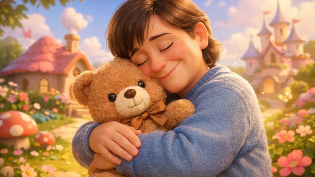 AI-Generated by Shutterstock (Prompt: Middle-aged person hugging an adorable teddy bear doll, emotional and comforting moment, soft body language, gentle smile, fluffy teddy bear with toy-like appearance, set in a bright 3D cartoon world, fairy-tale environment, warm pastel tones, soft sunlight, heartwarming and healing atmosphere, Disney Pixar style, cinematic lighting, smooth 3D animation render –ar 16:9)