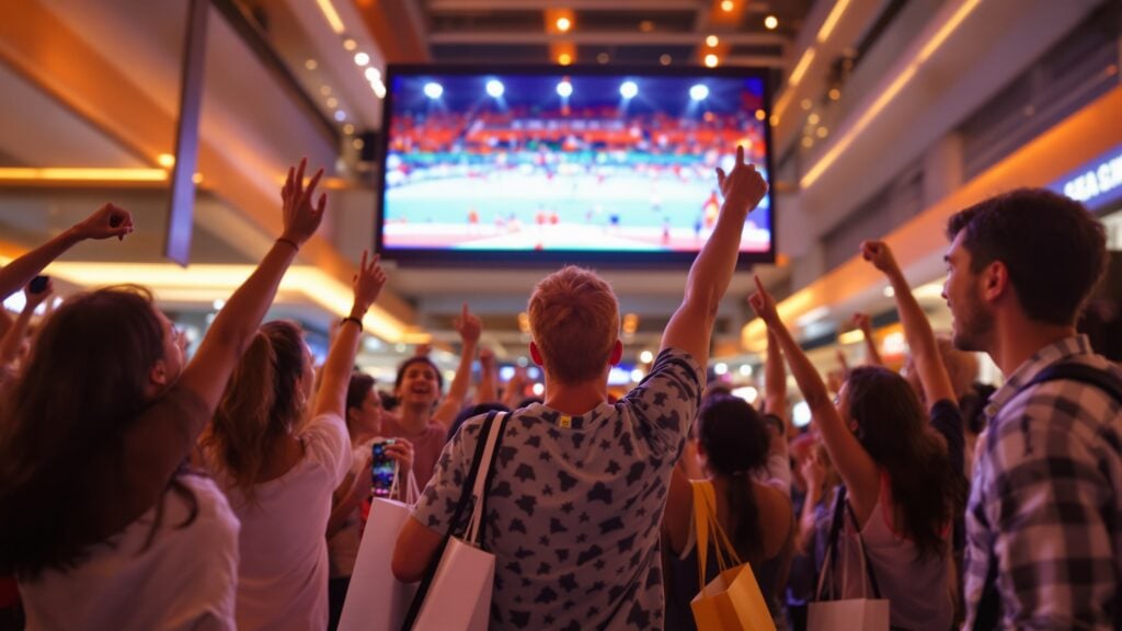 ขอบคุณภาพจาก Shutterstock AI Generator Prompt: A group of friends excitedly watching the SEA Games on a large screen in a modern shopping mall, some cheering, others holding shopping bags, dynamic expressions, warm orange lighting fills the scene, cinematic depth of field