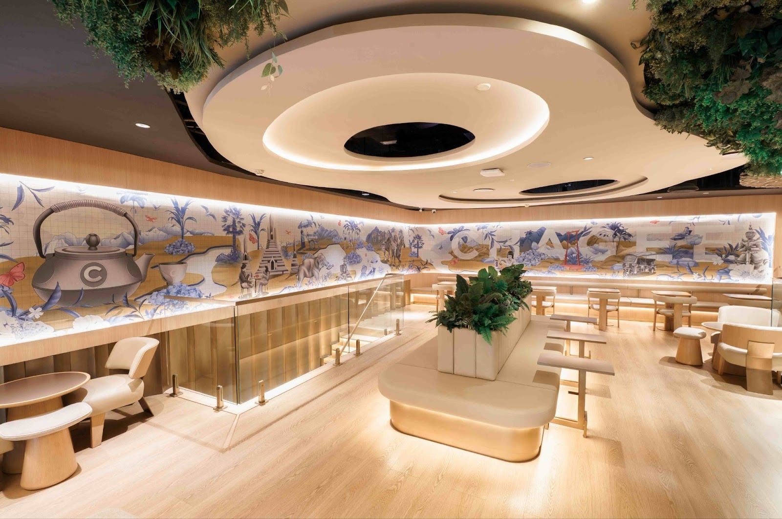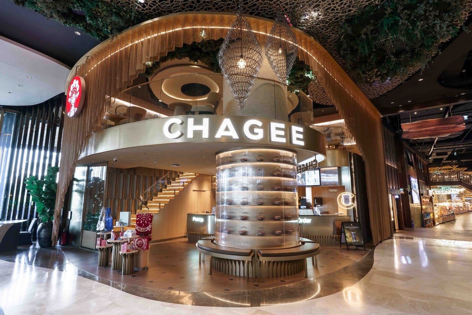นอกจากความสวยงามภายนอกแล้ว ภายในร้านยังถูกออกแบบให้มีชั้นลอยเพื่อขยายพื้นที่แห่งการพักผ่อน ภายใต้แนวคิด CHAGEE Together ที่ต้องการเปลี่ยนร้านชาให้เป็นพื้นที่เชื่อมโยงผู้คนเข้าด้วยกัน บรรยากาศภายในร้านให้ความรู้สึกอบอุ่น ผ่อนคลาย แต่ยังคงไว้ซึ่งความหรูหราร่วมสมัย เหมาะกับการหนีความวุ่นวายมานั่งจิบชาดีๆ สักแก้ว