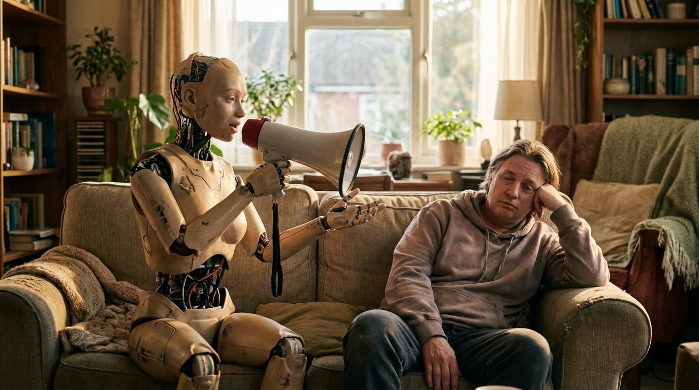 AI-Generated by Shutterstock (Prompt: A highly realistic cinematic scene of a human-like AI robot standing in a cozy living room, speaking loudly into a megaphone toward an ordinary person sitting on a couch at home. The person looks bored and uninterested, resting their head on one hand with a tired expression. Everyday home atmosphere, casual clothing, warm natural light through windows, soft background blur, ultra photorealistic style, detailed facial expressions, cinematic composition, 16:9 wide aspect ratio, high resolution.)