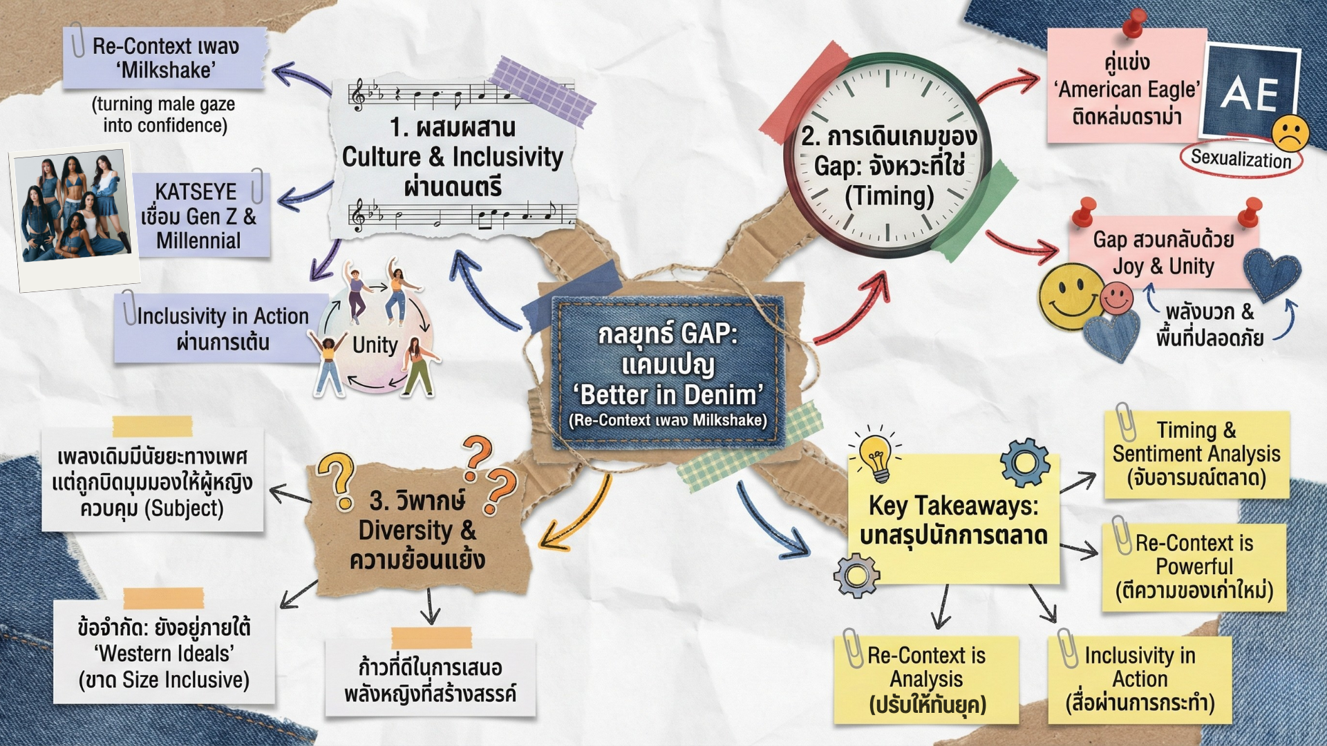 หัวใจความสำเร็จของ กลยุทธ์ GAP ในครั้งนี้ คือศิลปะการทำ Re-Context เพลงในตำนานอย่าง ‘Milkshake’ โดยพลิกมุมมองจาก Male Gaze สู่การแสดงออกถึงความมั่นใจและพลังของ Inclusivity ผ่านจังหวะดนตรี
