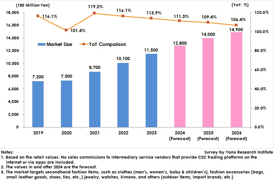 อีกหนึ่งปัจจัยที่แยกออกมาและเห็นภาพชัดเจนมากคือเทรนด์ตลาดเสื้อผ้ามือสองในญี่ปุ่นที่กำลังเติบโตอย่างรวดเร็วครับ ต้องบอกว่าตลาดนี้มีมูลค่าทะลุ 5 แสนล้านเยนไปแล้วตั้งแต่ปี 2023 และมีแนวโน้มเติบโตเฉลี่ย (CAGR) สูงถึงปีละ 10-12% ซึ่งการเติบโตนี้ไม่ได้เกิดจากเหตุผลเรื่องราคาถูกเพียงอย่างเดียวครับ