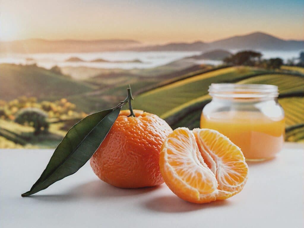 ขอบคุณภาพจาก Shutterstock AI Generator Prompt : A halved tangerine placed next to a whole tangerine in the foreground, showing the vibrant juicy inside. In the background, a scenic natural setting inspired by Jeju Island — soft hills, tangerine trees, and a gentle warm sky. Behind the fruits, a jar of orange marmalade and a steaming cup of orange tea are subtly placed. The overall atmosphere is warm, cozy, and peaceful, with natural lighting and a touch of lifestyle elegance. Styled like a product shoot with emotional storytelling, symbolizing transformation and comfort.