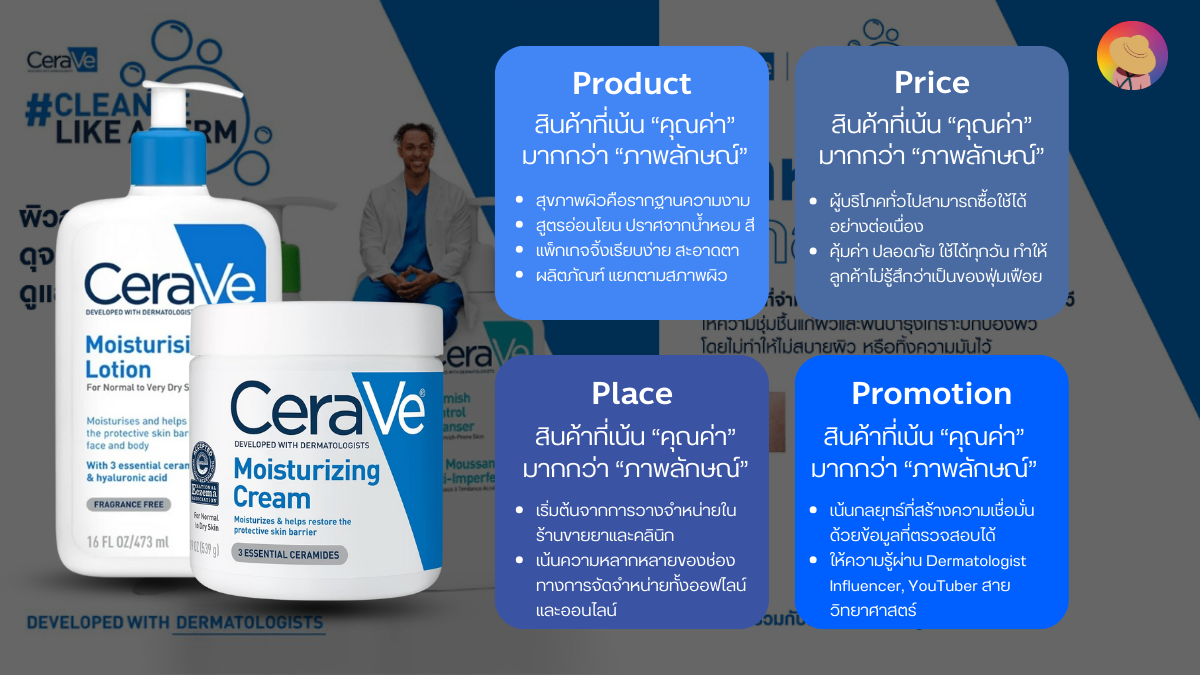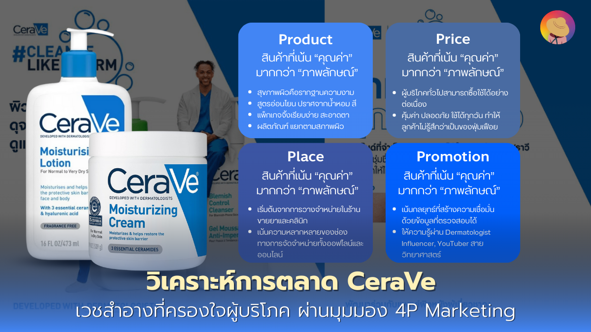 อย่างที่บอกว่าเพื่อเข้าใจว่าอะไรที่อยู่เบื้องหลังความสำเร็จนี้ เราจะใช้โมเดลการตลาดคลาสสิกที่เรียกว่า 4P Marketing Mix มาเป็นกรอบวิเคราะห์ CeraVe คือหนึ่งในแบรนด์ที่พลิกภาพลักษณ์จาก “สกินแคร์จากร้านขายยา” ให้กลายเป็นไอเท็มที่ทุกคนต้องมีในห้องน้ำค่ะ ด้วยความเรียบง่ายแต่ไว้ใจได้ การตลาดของ CeraVe ไม่ได้อาศัยความฉูดฉาด แต่สร้างความแข็งแรงผ่านการสื่อสารแบบมีหลักฐานและวิทยาศาสตร์รองรับค่ะ