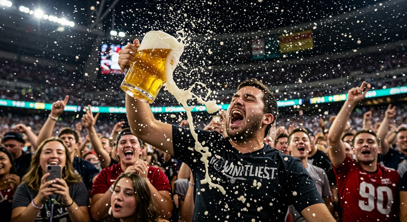 (AI-Generated Image by Shutterstock Prompt: a man celebrating wildly as beer spills from his mug, in a crowded football stadium, intense expression of joy, foam flying mid-air, vibrant crowd in background, match lighting, cinematic action shot