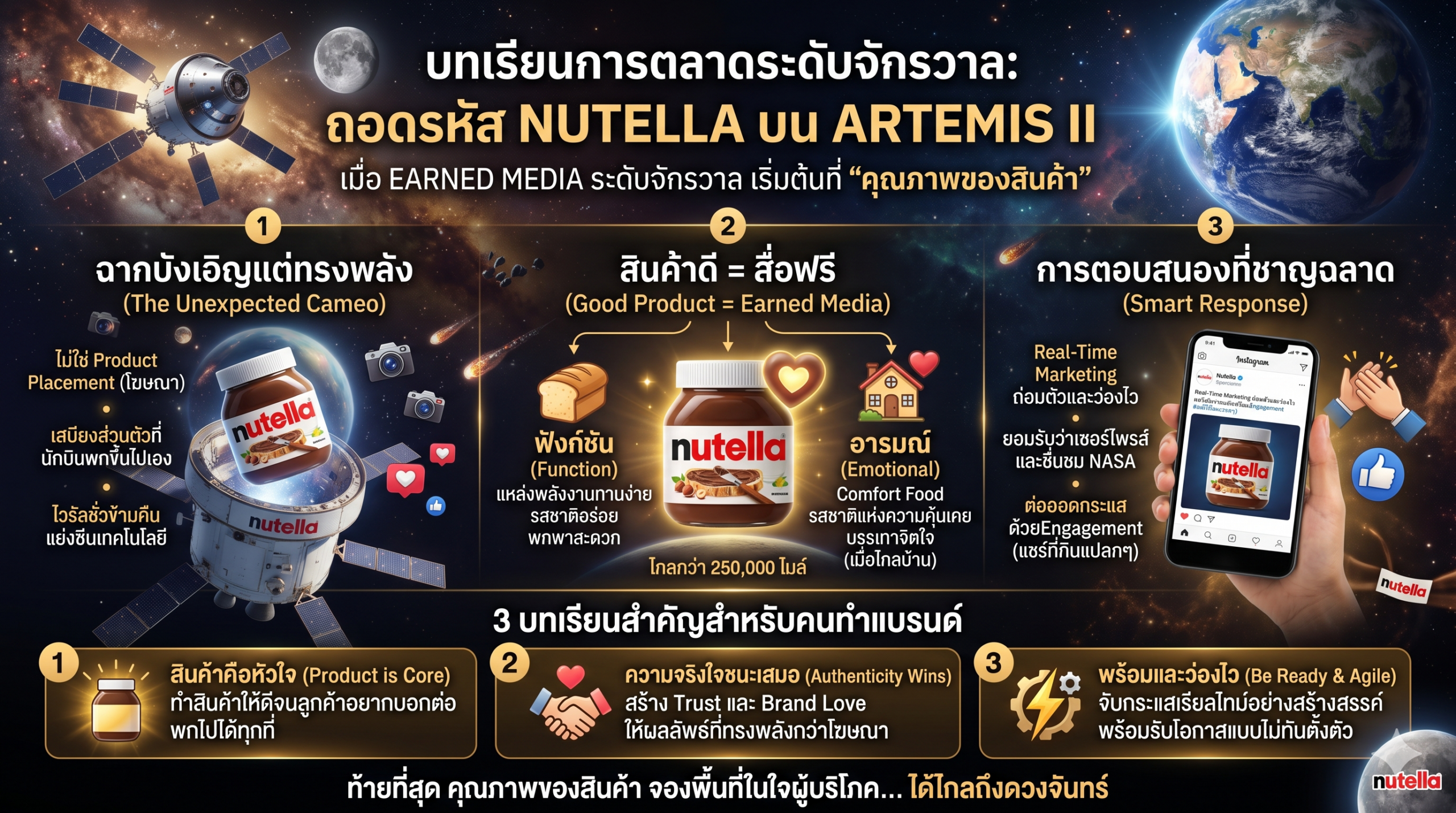 เคสของ Nutella บน Artemis II ทิ้งบทเรียนให้คนทำธุรกิจว่า การสร้างแบรนด์อาจไม่ได้จบแค่การซื้อพื้นที่โฆษณา หรือคิดแคมเปญโปรโมตสวยหรูเสมอไป แต่แก่นแท้คือการกลับมาดูแล Core Product ให้ดีและสามารถตอบสนองความต้องการของลูกค้าได้ครับ