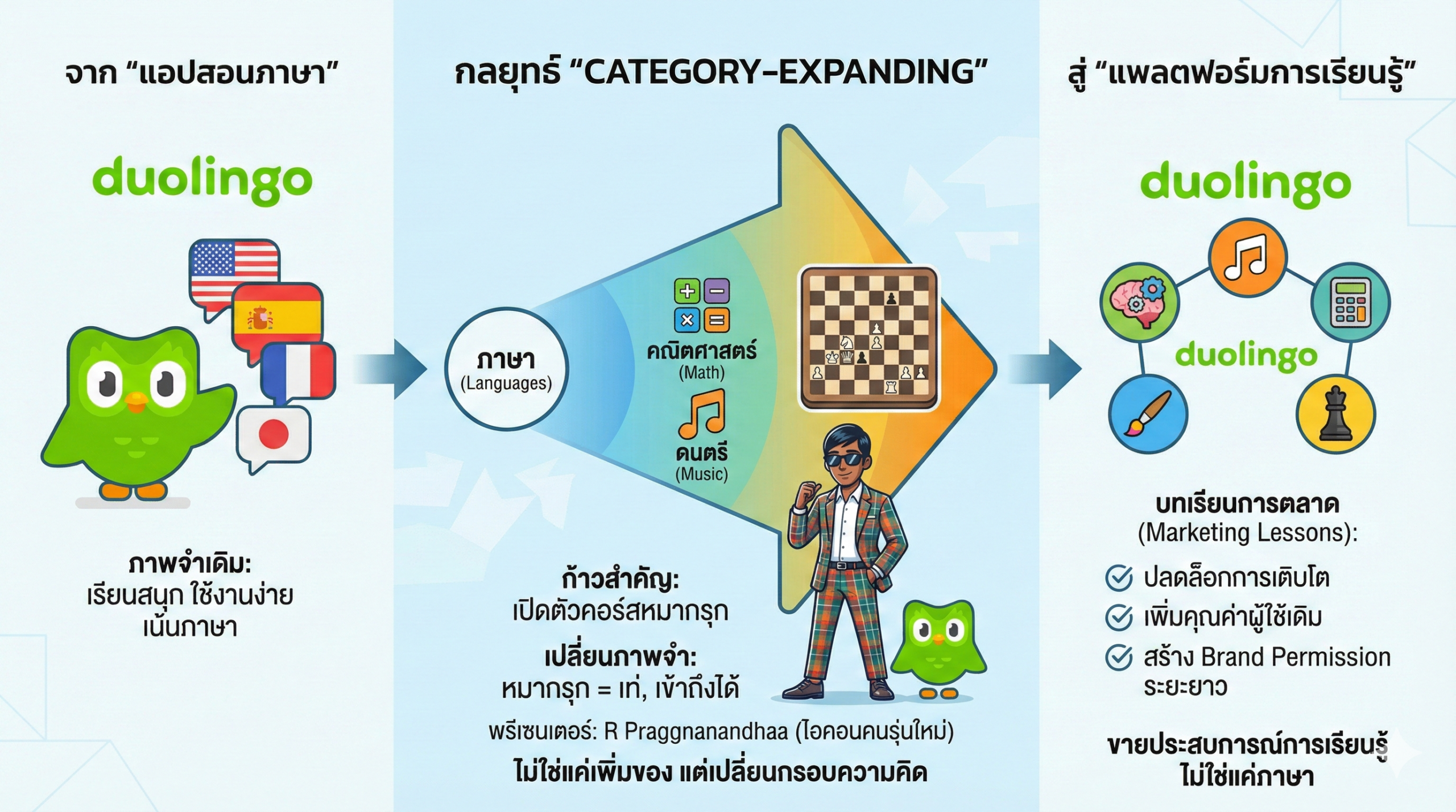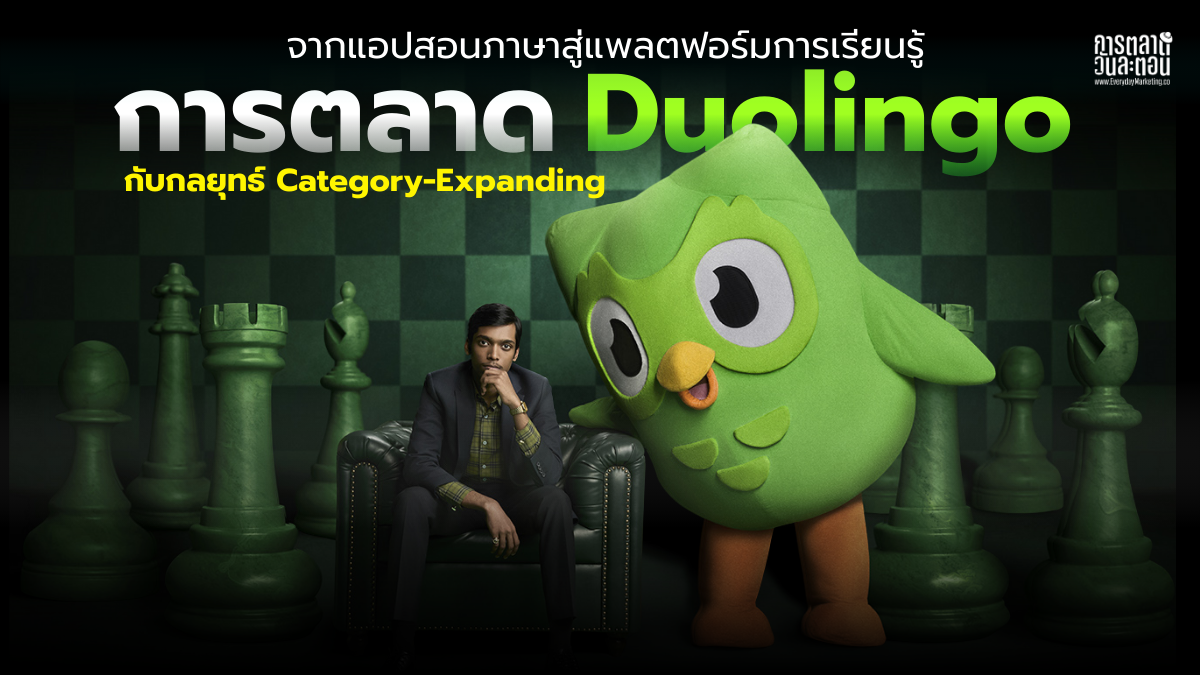ถ้าเรายังคิดว่า Duolingo คือแอปเรียนภาษาที่มีนกเขียวคอยทวงบทเรียนอยู่หน้าจอ เราอาจกำลังมองแบรนด์นี้เล็กเกินไป เพราะในช่วงไม่กี่ปีที่ผ่านมา Duolingo ค่อย ๆ ขยับตัวเองจากแอปสอนภาษาไปเป็นแพลตฟอร์มการเรียนรู้ ที่สอนทุกอย่างตั้งแต่คณิตศาสตร์ ดนตรี ไปจนถึงหมากรุก เกมกระดานโบราณที่ทั้งโลกยอมรับว่าใช้ทักษะทางความคิดสูงและเข้าถึงยาก บทความนี้จะพามาดู การตลาด Duolingo ใช้ Category-Expanding จากแอปสอนภาษาสู่แพลตฟอร์มการเรียนรู้กันครับ