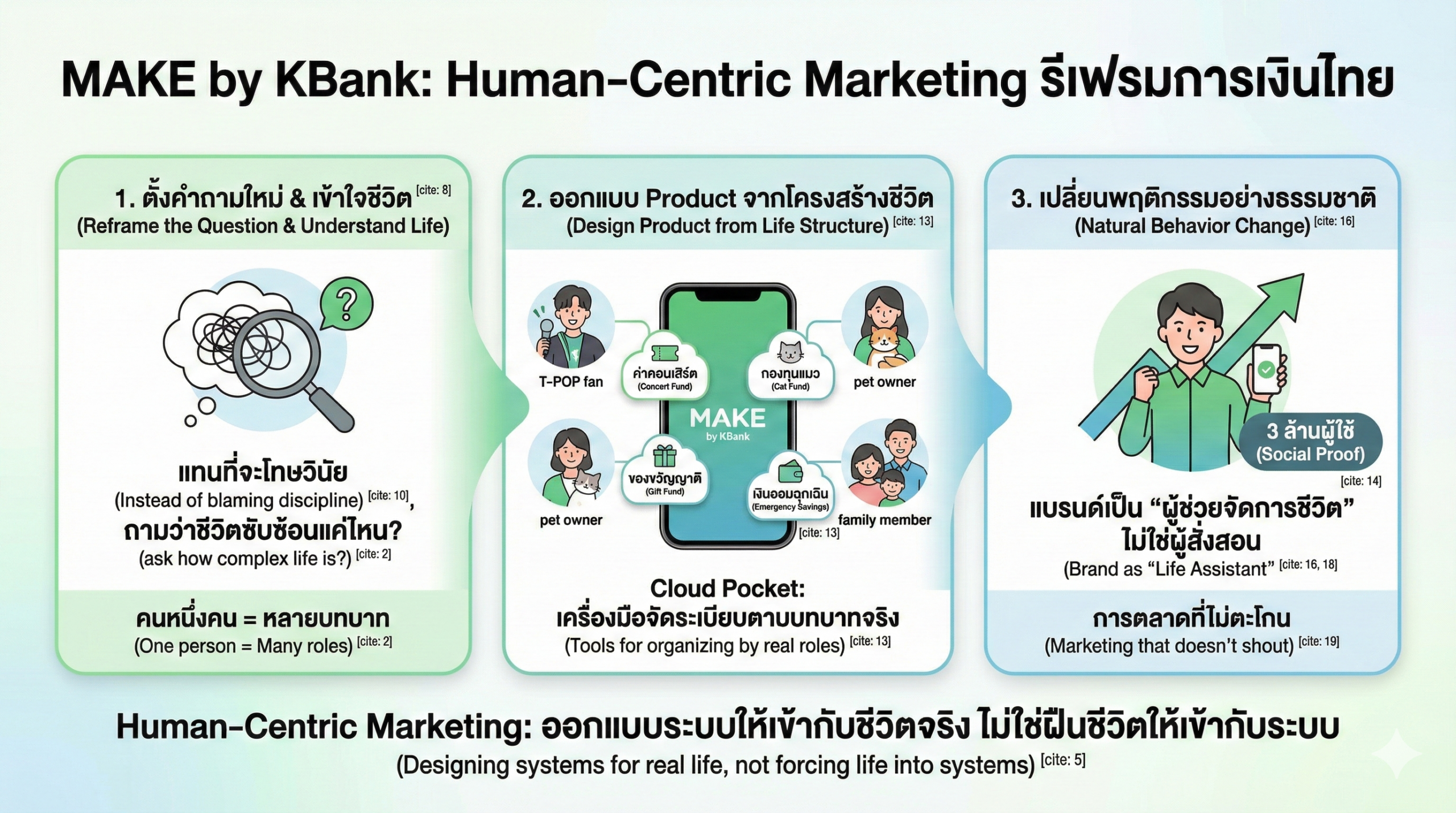 ดังนั้นการรีเฟรมไม่ใช่การเปลี่ยนคำพูดให้ดูดีขึ้น แต่คือการเปลี่ยนกรอบที่เราใช้มองปัญหาทั้งชุด เมื่อกรอบเปลี่ยน วิธีแก้ก็จะเปลี่ยนตามไปด้วย ในด้านการเงินไทย การรีเฟรมของ MAKE by KBank คือการย้ายปัญหาจากคนไม่รู้จักออม ไปสู่ ชีวิตคนยุคใหม่มีหลายบทบาทจนเงินหลุดระบบ