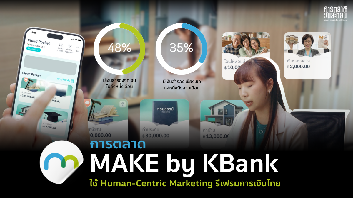 เวลาพูดถึงปัญหาการเงินของคนไทย เรามักได้ยินคำอธิบายเดิม ๆ ไม่ออม ใช้เงินเกินตัว ไม่มีวินัย และสุดท้ายบทสรุปก็มักจะจบที่การโทษตัวบุคคลว่า ยังจัดการเงินไม่เก่งพอ แต่ MAKE by KBank เลือกเริ่มจากมุมที่ต่างออกไป บทความนี้จะพามาดู การตลาด MAKE by KBank ใช้ Human-Centric Marketing รีเฟรมการเงินไทย