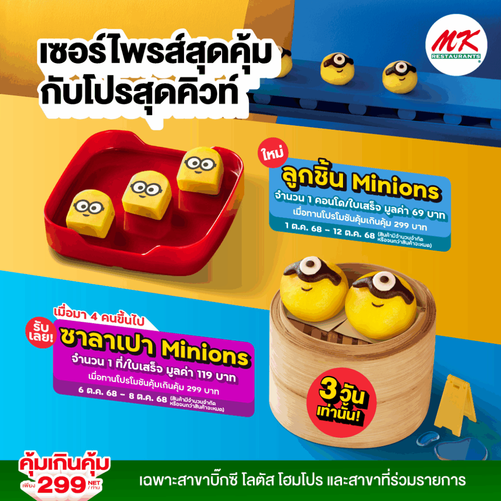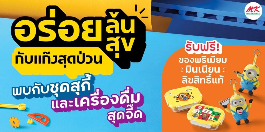MK x Minions ออกแบบประสบการณ์ให้ล้นสุข สมชื่อแคมเปญจริง ๆ ตั้งแต่เดินเข้าร้าน ยันเช็กบิลกลับบ้าน เราจะเจอกับความป่วนแบบน่ารัก ๆ ของแก๊งมินเนี่ยนทุกจุด เรียกว่าแคมเปญนี้ทำครบทั้ง เมนู, บรรยากาศ, ของสะสม และโปรโมชั่น