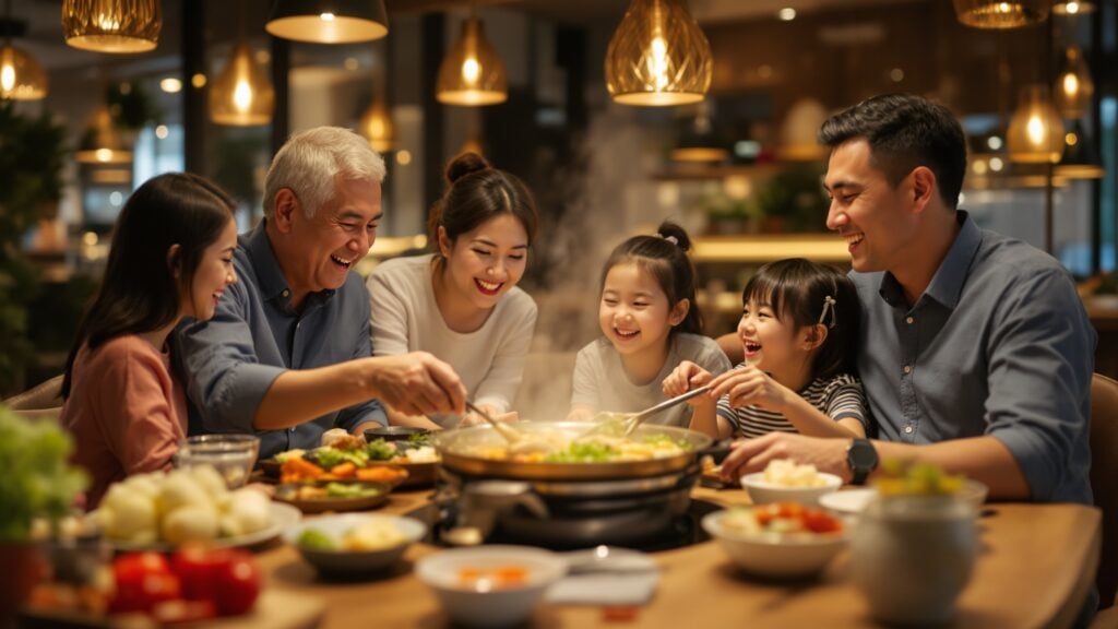 ขอบคุณภาพจาก Shutterstock AI Generator : a modern MK restaurant interior, multi-generational Thai family enjoying hotpot together, lively and heartwarming moment, grandparents, parents, and children interacting joyfully, contemporary decor, warm ambient lighting, cinematic depth of field