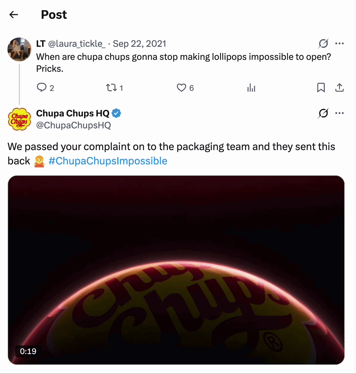 เมื่อมีคนหนึ่งโพสต์ตั้งคำถามว่า “ทำ Chupa Chups มันต้องแกะยากขนาดนี้?” แบรนด์มองเห็นโอกาสและเล่นมุกใส่ซะเลย พวกเขาเข้าไปตอบกลับคอมเมนต์ของแฟนคลับคนนั้นด้วยประโยคสั้น ๆ ว่า “เรามีทั้งข่าวดีและข่าวร้ายมาบอก…”
