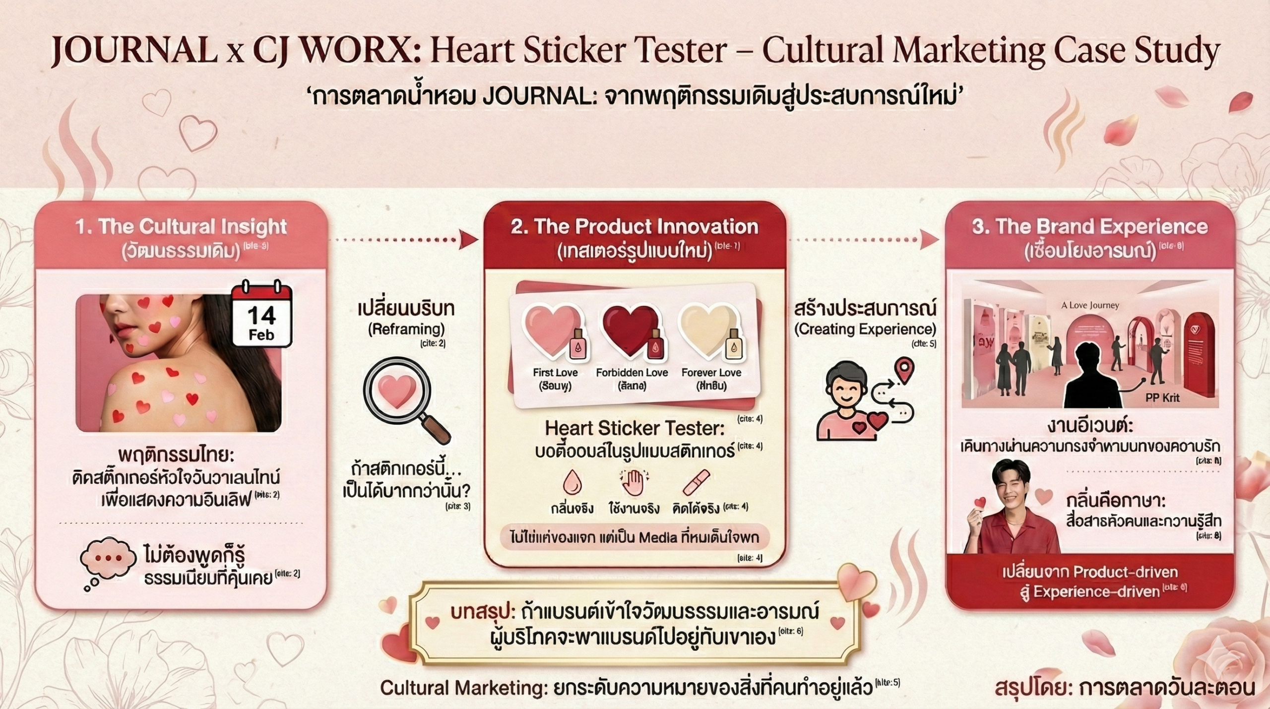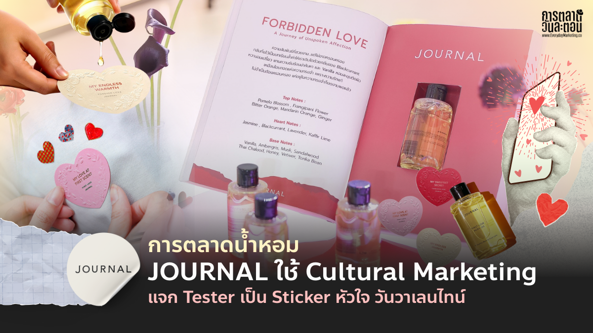 บางครั้งการทำแคมเปญของแบรนด์อาจไม่ได้เริ่มจากการคิดไอเดียใหม่ที่ไม่เคยมีใครทำ แต่เริ่มจากการมองสิ่งเดิม ๆ แล้วตั้งคำถามว่า ถ้าสิ่งนั้นสามารถทำหน้าที่ได้มากกว่านี้ล่ะ จะเกิดอะไรขึ้น แคมเปญ Heart Sticker Tester ของ JOURNAL ที่ทำร่วมกับ CJ WORX Thailand คือหนึ่งในตัวอย่างที่ชัดเจน บทความนี้เลยจะพามาดู การตลาดน้ำหอม JOURNAL ใช้ Cultural Marketing แจก Tester เป็น Sticker หัวใจ วันวาเลนไทน์