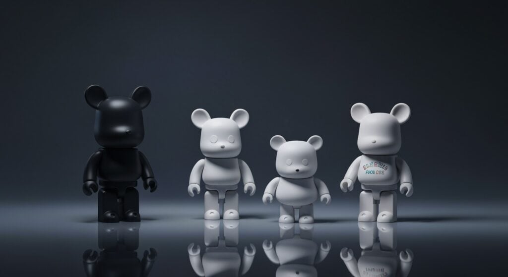 ขอบคุณภาพจาก Shutterstock AI Generator: a cinematic studio photoshoot of an exclusive art toy collaboration between a trendy streetwear brand and a high-end ceramic brand, dramatic lighting, moody atmosphere, premium textures of ceramic and vinyl, soft shadows and reflective surfaces