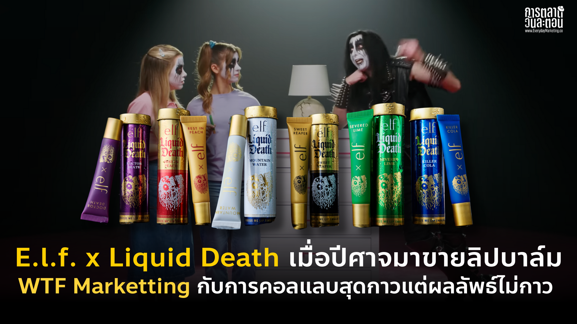 การตลาดวันละตอนวันนี้พามาดูแคมเปญคอลแลบสุดกาว WTF Marketting ที่พิสูจน์ว่าความบ้าคืออาวุธการตลาดที่น่ากลัว ถ้าเพื่อน ๆ คิดว่าเครื่องสำอาง กับน้ำเปล่ากระป๋อง เป็น Category ที่อยู่คนละโลก คุณคิดถูกแล้วครับ แต่ความพีคมันอยู่ตรงที่ E.l.f. Cosmetics และ Liquid Death เลือกที่จะเอา 2 Category นี้มาชนกัน จนเกิดเป็นแรงระเบิดตูมตามบนโซเชียลฯ เมื่อต้นปี 2026 ที่ผ่านมาครับ เดี๋ยววันนี้เรามาแกะรอยแคมเปญ Lip Embalms แคมเปญคอลแลบระหว่างเครื่องสำอาง กับน้ำเปล่ากระป๋อง ไปด้วยกันครับ
