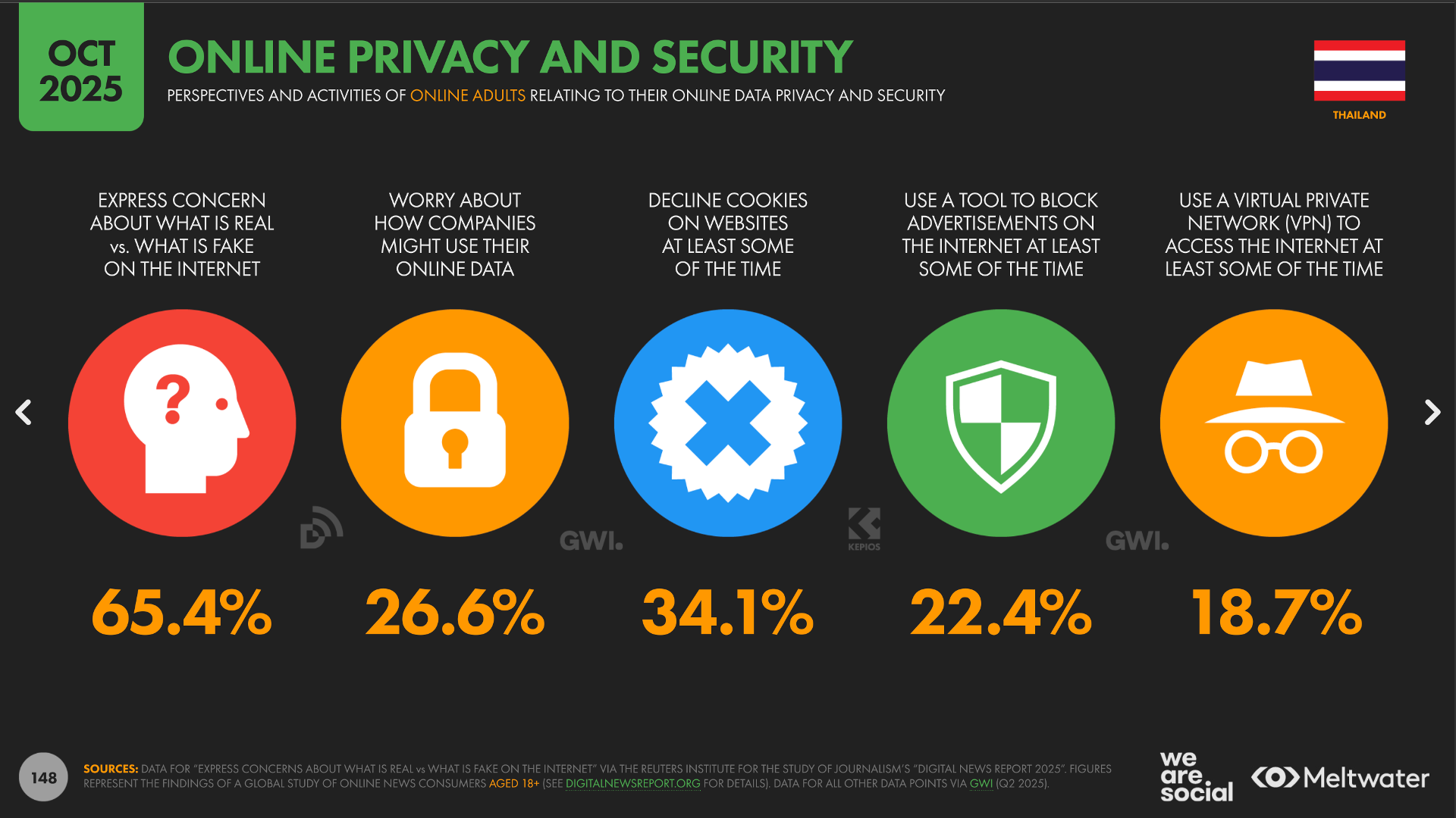 23. 64.5% รู้สึกกังวลกับเรื่อง Fake News ไม่แน่ใจในสิ่งที่เห็นบนออนไลน์มากขึ้น 24. 26.6% รู้สึกว่าบริทษัท หรือหน่วยงานต่างๆ ที่มี Personal Data ของตัวเองอาจเอาข้อมูลส่วนตัวไปใช้โดยไม่ได้รับอนุญาติ หรือเกินกว่าที่ได้รับอนุญาติ 25. 34.1% ของคนไทยไม่กดรับ Web Cookies 26. 22.4% ของคนไทยติดตั้งระบบ Block Ad ปิดกั้นโฆษณาบนออนไลน์ 27. 8.7% ของคนไทยเล่นเน็ตผ่าน VPN เพื่อความเป็นส่วนตัวขั้นสุด แนะนำพี่วัว BullVPN เลย