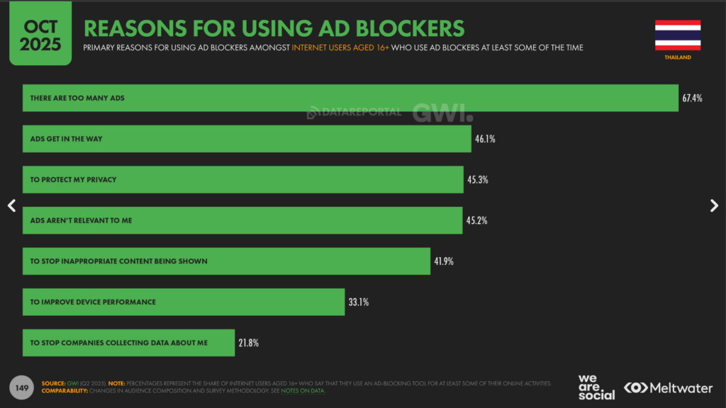 คนไทยเริ่ม Ad Block (22.4%), ไม่รับ Cookies (34.1%) และใช้ VPN (18.7%) เพราะรำคาญโฆษณาที่เยอะเกินไป เกะกะ และไม่เกี่ยวกับตัวเอง