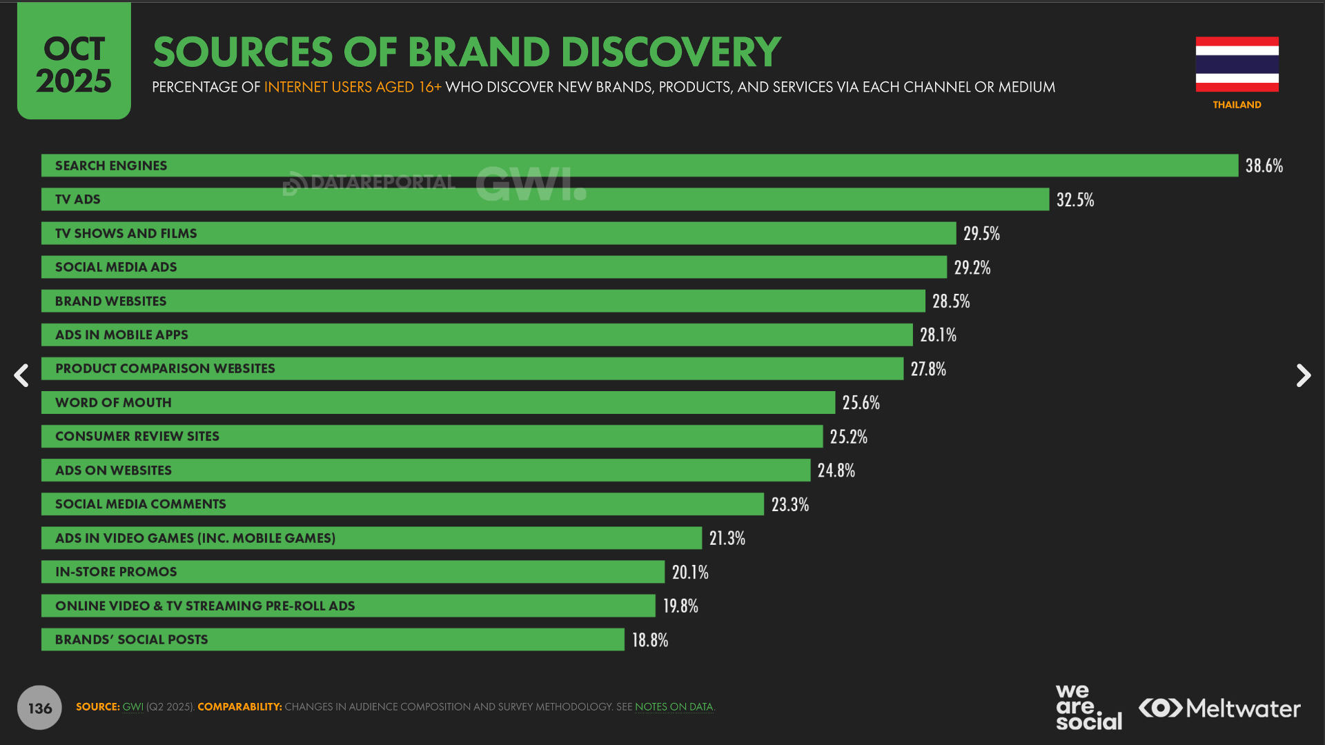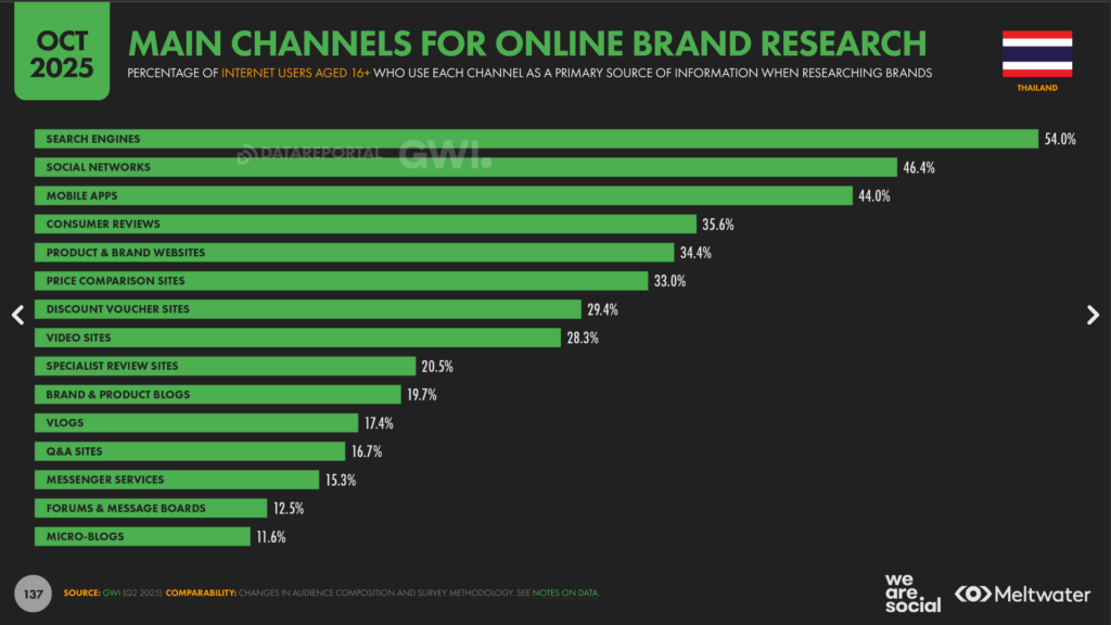 Search Engines (Google/Bing) เป็นอันดับ 1 ทั้งในการที่คน “เริ่มรู้จักแบรนด์” (38.6%) และใช้ “ค้นหาข้อมูลเพิ่มเติม” (54%)