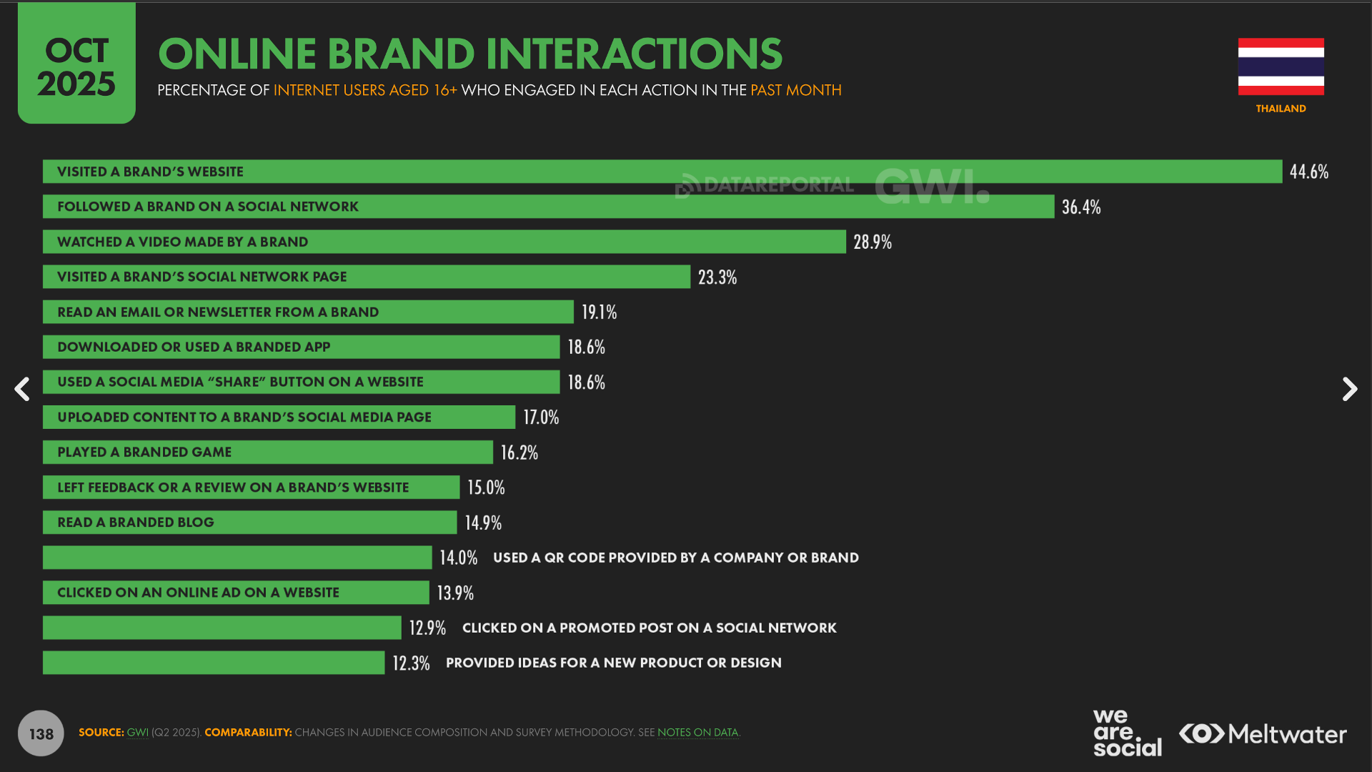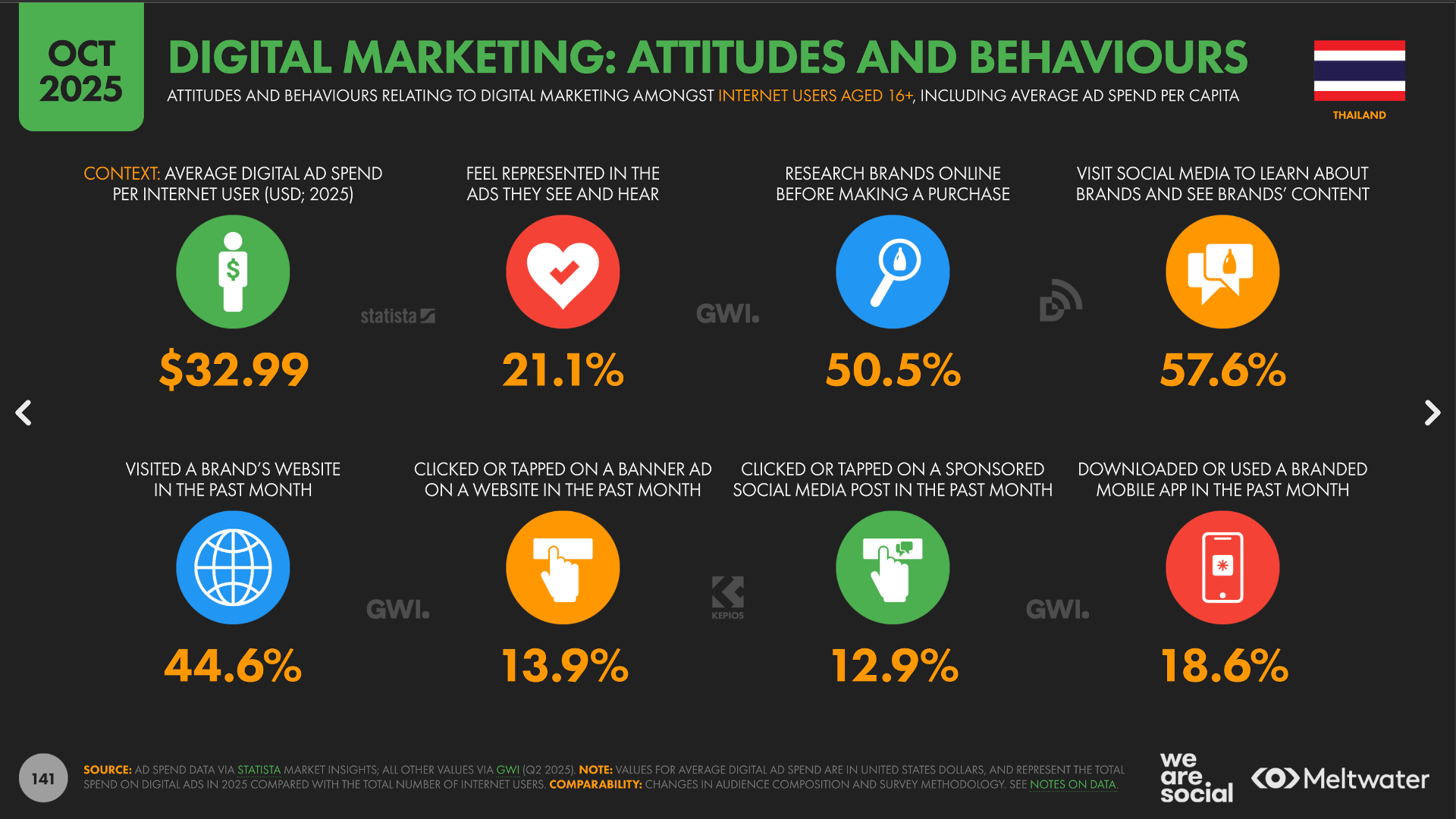9. 1,054 บาท คืองบการตลาดออนไลน์เฉลี่ยต่อคนไทยหนึ่งคน 10. 21.1% รู้สึกว่าโฆษณาออนไลน์ที่เห็นนั้นเกี่ยวกับตัวเขา แสดงว่าอีกกว่า 80% รู้สึกว่าโฆษณาที่เห็นนั้นไม่ได้เกี่ยวอะไรกับพวกเขาเลย!! 11. 50.5% หาข้อมูลทางออนไลน์ก่อนตัดสินใจซื้อ แสดงว่ามีอีกเกือบ 50% ที่ตัดสินใจซื้อทันทีโดยไม่หาข้อมูล!! Impluse Shopper 12. 57.6% เข้าไปดูโซเชียลมีเดียของแบรนด์ ดูว่าแบรนด์โพสอะไรบ้าง 13. 44.6% เข้าไปดูเว็บของแบรนด์ที่สนใจในหนึ่งเดือนที่ผ่านมา 14. 13.9% กดแบนเนอร์โฆษณาตามเว็บในเดือนที่ผ่านมา 15. 12.9% กดโฆษณาที่เห็นบนโซเชียลมีเดียในเดือนที่ผ่านมา 16. 18.6% ดาวน์โหลดหรือใช้งานแอปของแบรนด์ในเดือนที่ผ่านมา