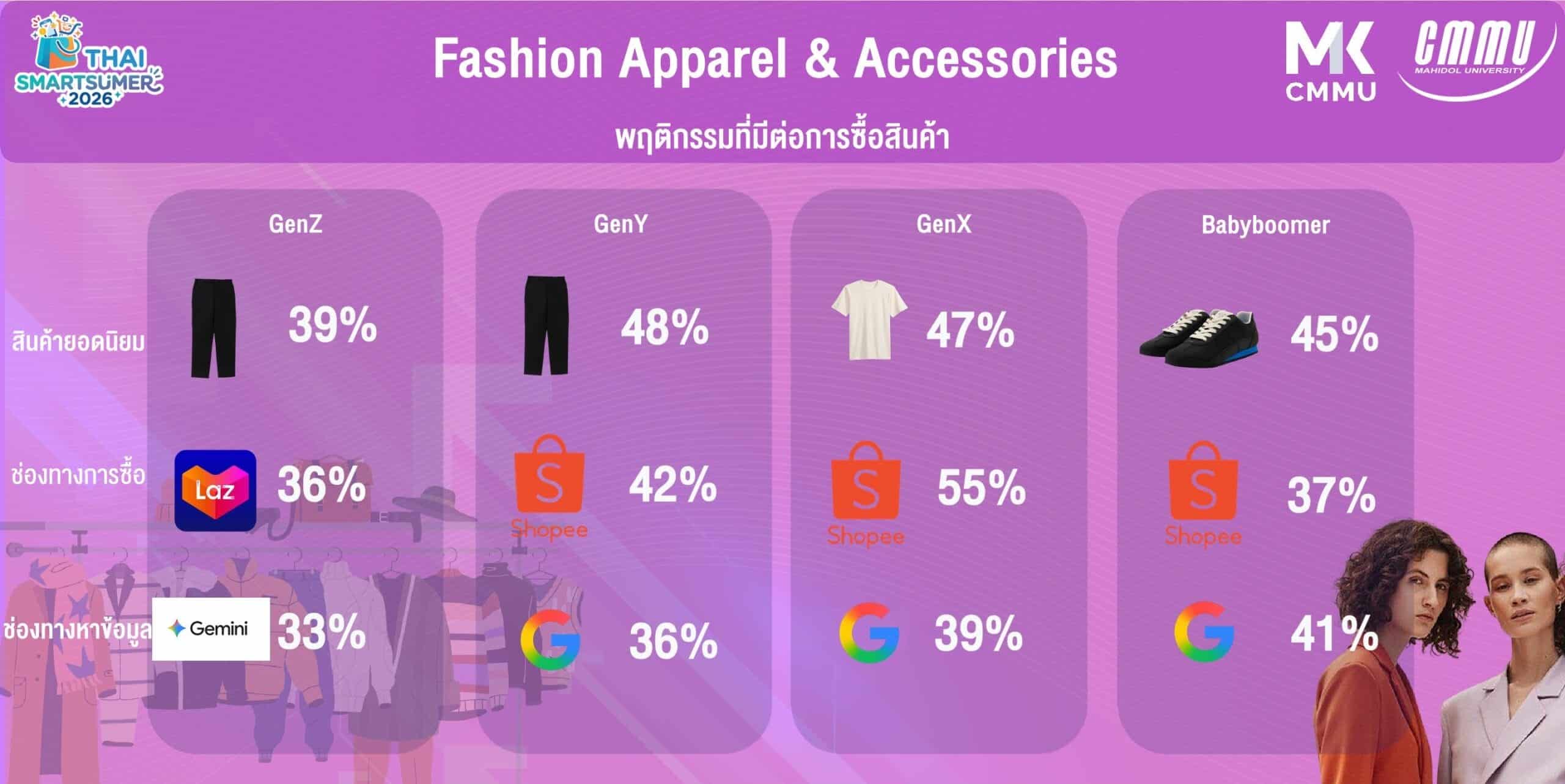 Fashion แม้การตัดสินใจยังมาจาก “ความอยากได้” เป็นหลัก แต่ผู้บริโภคเริ่มใช้ AI เป็นแหล่งค้นหาข้อมูลแทนโซเชียลมีเดียบางส่วน แสดงให้เห็นการเปลี่ยนผ่านของพฤติกรรม