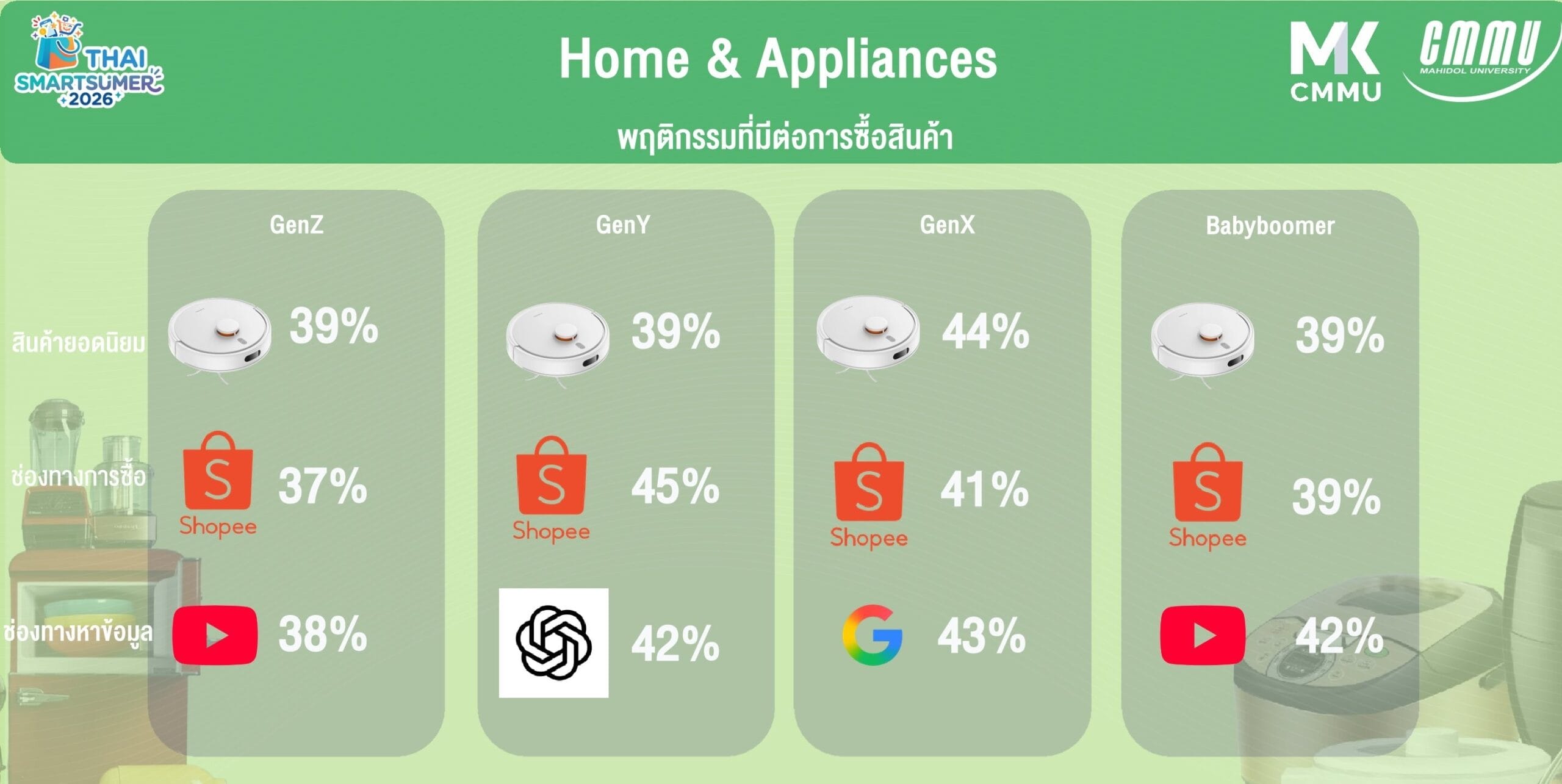 Home & Appliances เป็นหมวดที่ใช้เวลาตัดสินใจนานที่สุด โดยมีถึง 85.5% ค้นหาข้อมูลก่อนซื้อและ 90–97% ศึกษาข้อมูลเชิงลึก ผู้บริโภคให้ความสำคัญกับ Video Review และ Demo เพื่อสร้างความเข้าใจก่อนซื้อ สะท้อนความต้องการความมั่นใจในสินค้าที่มีมูลค่าสูง