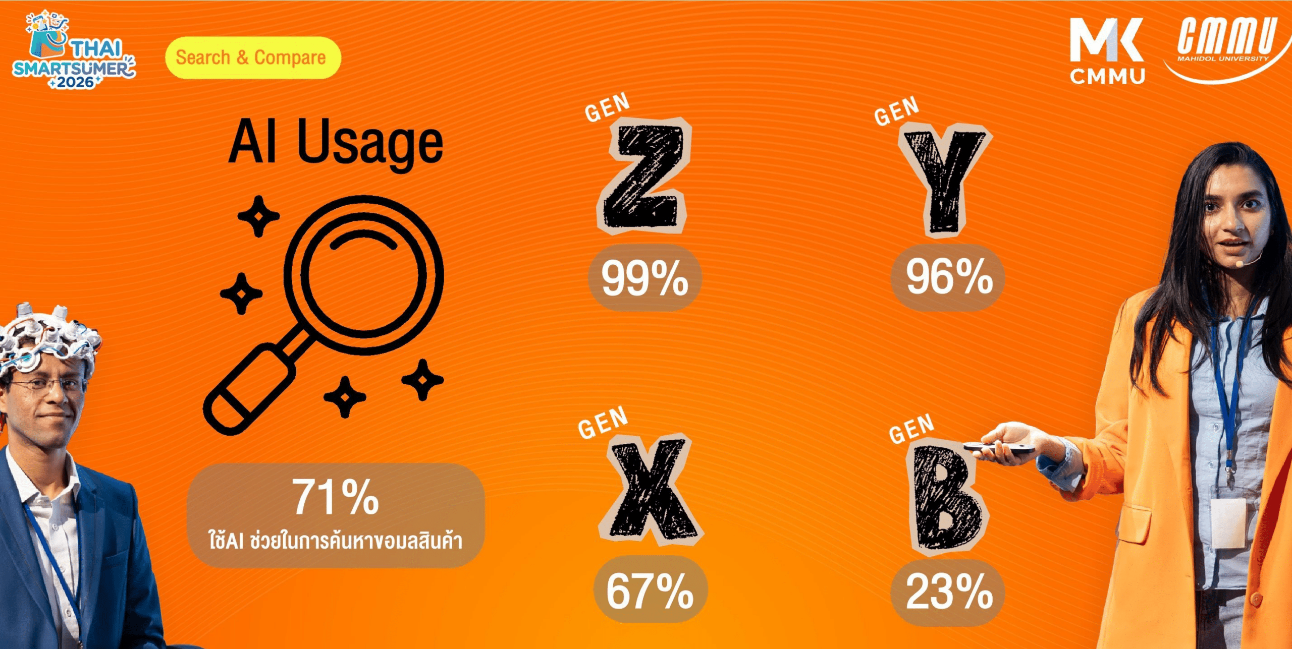 อีกหนึ่งการเปลี่ยนแปลงสำคัญของผู้บริโภคไทยในปี 2026 คือการที่ AI ก้าวเข้ามามีบทบาทในทุกขั้นตอนของการตัดสินใจซื้อค่ะ โดยงานวิจัยระบุว่า กว่า 71% ของผู้บริโภคไทยใช้ AI เป็นเครื่องมือหลักในการหาข้อมูลสินค้า และช่วยตัดสินใจ แซงหน้าพฤติกรรมการค้นหาผ่านแพลตฟอร์มแบบเดิมอย่างเห็นได้ชัดเลยค่ะ โดยเฉพาะในกลุ่มคนรุ่นใหม่อย่าง Gen Z ที่มีอัตราการใช้ AI สูงถึง 99% และ Gen Y ที่ 96% ซึ่งสะท้อนว่า AI ไม่ได้เป็นแค่เทคโนโลยีทางเลือกอีกต่อไป แต่กำลังกลายเป็น “ผู้ช่วยส่วนตัว” ของผู้บริโภคในชีวิตประจำวัน