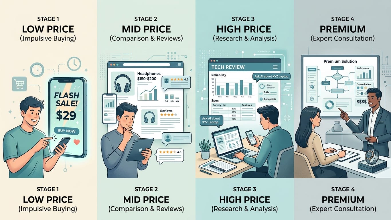ขอบคุณรูปภาพจาก Shutterstock Prompt: A conceptual illustration of modern consumer decision-making based on price tiers, showing a progression from impulsive buying to deep research. Visualize 4 stages: low price (quick emotional decision), mid price (comparison and reviews), high price (research and analysis), and premium (expert consultation). Include elements like smartphone with AI assistant, charts, product comparisons, reviews, and thoughtful consumer. Clean, modern, editorial style, soft lighting, minimal color palette, marketing article illustration, high resolution