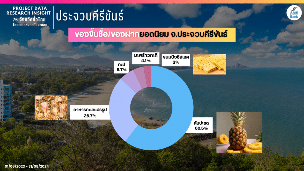 มาถึงหมวดสุดท้ายกันแล้วกับ ของฝากยอดนิยม จังหวัดประจวบคีรีขันธ์ จาก Insight ชี้ชัดมาว่า ‘สับปะรด’ คือของฝากที่ถูกพูดถึงมากที่สุดค่ะ คิดเป็น 60.5% รองลงมาคือ อาหารทะเลแปรรูป กะปิ มะพร้าวกะทิ และขนมปังชีสเชคนั่นเองค่ะที่มักเป็นของขึ้นชื่อและของฝากยอดนิยมที่คนมักซื้อกลับไปฝากคนอื่น ๆ พิมพ์ไปก็หิวไป ใครที่ขายอาหารเหล่านี้ลองปรับกลยุทธ์มาโปรโมทเป็นของฝากกัน ขายง่ายขายคล่อง หรือใครที่กำลังมองหาของขายเป็นของฝาก หวังว่า Data เหล่านี้จะเป็นประโยชน์นะคะ