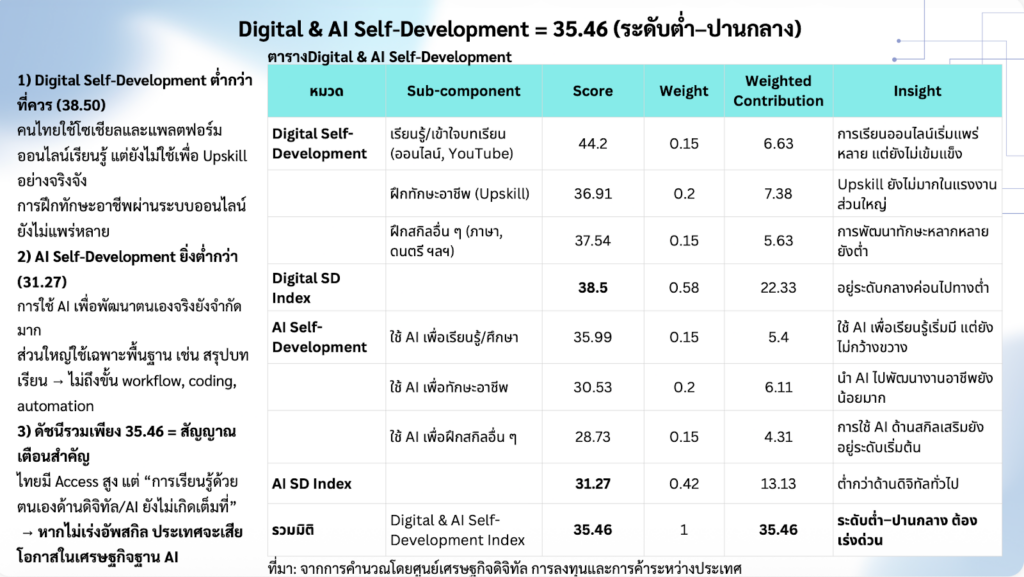 แต่จุดที่น่าเสียดายคือเรายังสอบตกเรื่องการใช้ AI เชิงกลยุทธ์ครับ เพราะคะแนนด้านการลดค่าใช้จ่าย 45.39 และ การเพิ่มรายได้ 45.55 นั้นต่ำเตี้ยเรี่ยดิน ซึ่งชี้ชัดว่าเรายังมอง AI เป็นแค่ตัวช่วยให้งานเสร็จไวขึ้น แต่ยังหาวิธีใช้มันเพื่อหาเงินเข้ากระเป๋า หรือลดต้นทุนธุรกิจอย่างเป็นรูปธรรมไม่เจอ หากไม่รีบปลดล็อกตรงนี้ ไทยจะเป็นได้แค่ประเทศผู้ใช้ AI ที่ทำงานเร็ว แต่เศรษฐกิจไม่ได้โตขึ้นตามความเร็วของ AI ครับ