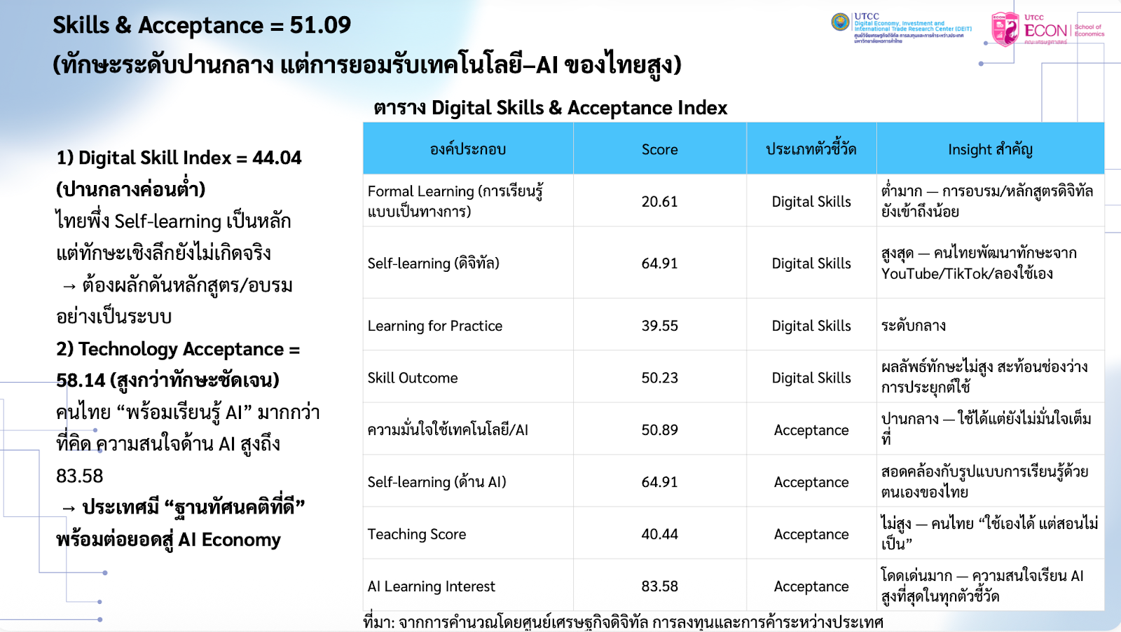 โดยจุดแข็งที่สุดของเราคือการใช้ AI เพื่อลดเวลาทำงาน ที่ได้คะแนนนำโด่ง 50.83 แสดงให้เห็นว่าคนไทยเก่งในการใช้ AI เป็นเหมือน “เลขาส่วนตัว” ช่วยจัดการงานซ้ำซากจำพวกงานเอกสาร สรุปประชุม หรือทำสไลด์ได้ดีเยี่ยม