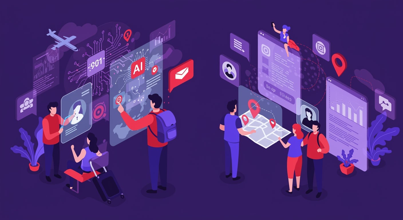 ขอบคุณภาพจาก Shutterstock AI Generator Prompt : A flat vector-style digital illustration in a bold, modern, and artistic design. The color palette emphasizes deep purple, violet gradients, and vibrant red accents, creating a futuristic yet human-centered mood. The scene shows diverse travelers engaging with AI technology: one using an AI-powered holographic travel planner, another speaking through an AI translation assistant, and a group receiving AI recommendations for local cultural experiences. In the background, abstract digital shapes (circuits, glowing data streams, holographic icons) blend with travel elements like airplanes, maps, and location pins, symbolizing the fusion of human travel and AI technology. The style is clean, conceptual, and striking, with expressive characters and a strong contrast of purple tones.