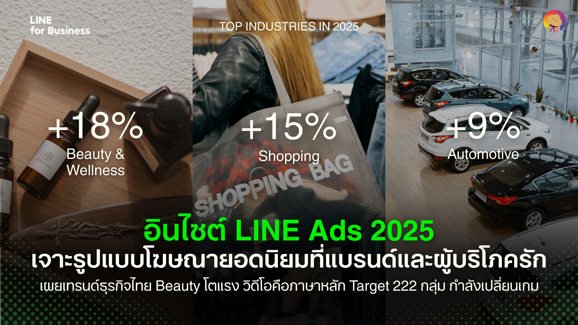 เวลามองไปที่อุตสาหกรรมที่ใช้ LINE Ads เยอะที่สุดในปีนี้ แชมป์ยังคงเป็น กลุ่มความงาม & สุขภาพ ที่โตขึ้นถึง 18% เพราะพฤติกรรมคนไทยหันมาใส่ใจสุขภาพและความสวยความงามมากขึ้นทุกปี ไม่ว่าจะเป็นสกินแคร์ คลินิกความงาม หรืออาหารเสริม ต่างก็เลือก LINE Ads เป็นเครื่องมือหลักในการเข้าถึงลูกค้า