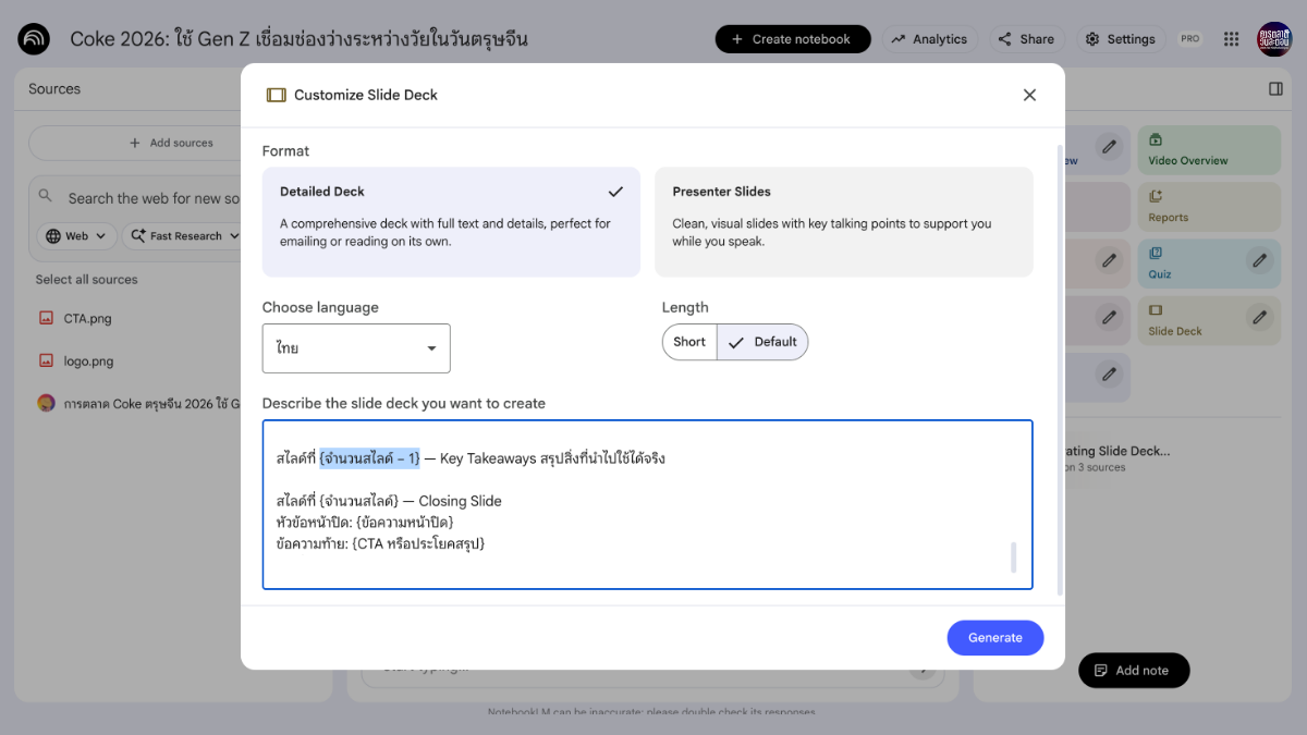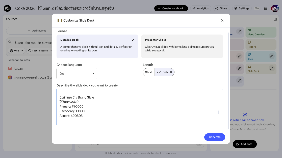 เวลาใช้ NotebookLM สร้าง Slide Deck ให้กำหนด CI แบบชัดเจน เช่น