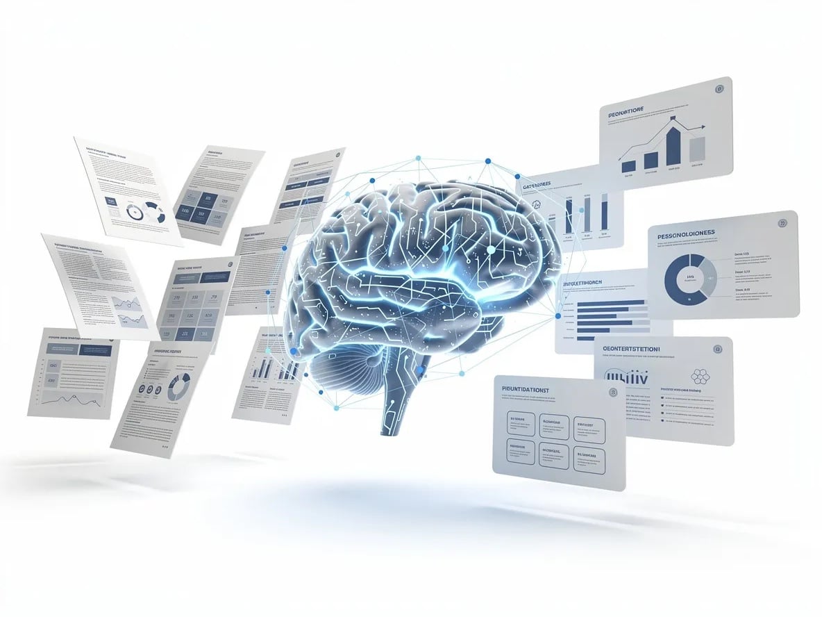 ขอบคุณภาพจาก Shutterstock AI Generator Prompt : A conceptual illustration of an AI brain organizing floating documents into structured presentation slides, clean white background, minimal modern design, strategic business mood, soft shadows, blue and neutral color palette, cinematic lighting, ultra detailed, high resolution, no text, no watermark
