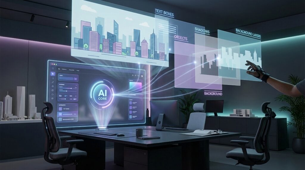 AI Generated by Shutterstock (Prompt: a futuristic creative workspace where a flat ai generated image is transforming into multiple editable layers floating in the air. the scene shows a designer interface similar to a modern design editor, with separated elements like text boxes, objects, shadows, and background layers hovering individually. a glowing ai core in the center analyzes the image and breaks it into layers with soft light beams. some layers are being moved and resized, showing flexible editing. the visual metaphor illustrates turning a final ai image into editable design assets. clean modern ui, minimal tech aesthetic, soft gradients, creative studio lighting, ultra detailed, realistic 3d render, cinematic composition.)