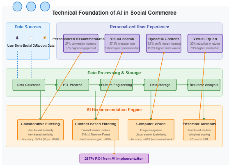 โครงสร้างการทำงานของ Social Commerce ด้วย AI-Driven จะเริ่มจากการนำเข้า Input Data ที่เป็นข้อมูลจากหลายแหล่ง หลายแพลตฟอร์ม ซึ่งข้อมูลเหล่านี้ได้แก่ พฤติกรรมผู้ใช้, ข้อมูลโซเชียล หรือข้อมูลสินค้า ซึ่งจะถูกรวบรวม และประมวลผลผ่านกระบวนการต่างๆ (โซนสีเขียว) จากนั้นจะถูกป้อนเข้าสู่ AI Recommendation Engine (โซนสีส้ม) ซึ่งใช้ AI Model หลายตัวรวมกันในการประมวลผล โดยผลลัพธ์ที่ได้คือฟีเจอร์ที่ User เห็นและสัมผัสเป็นประสบการณ์ส่วนบุคคลได้ ได้แก่ Personalized Recommendation, Visual Search, Dynamic Content และ Virtual Try-on (โซนสีม่วง) และมี Feedback Loop ที่ทำให้ข้อมูลใหม่ๆ จากพฤติกรรมของ User ไหลกลับมาปรับปรุง AI Model อย่างต่อเนื่อง ส่งผลให้โครงสร้างนี้เป็นแบบ Adaptive ที่ทำให้มี ROI ถึง 267% (ป.ล.ตามรูปที่เค้าเคลมมานะคะ,, ส่วนจะจริงไม่จริงต้องลองดู^^)