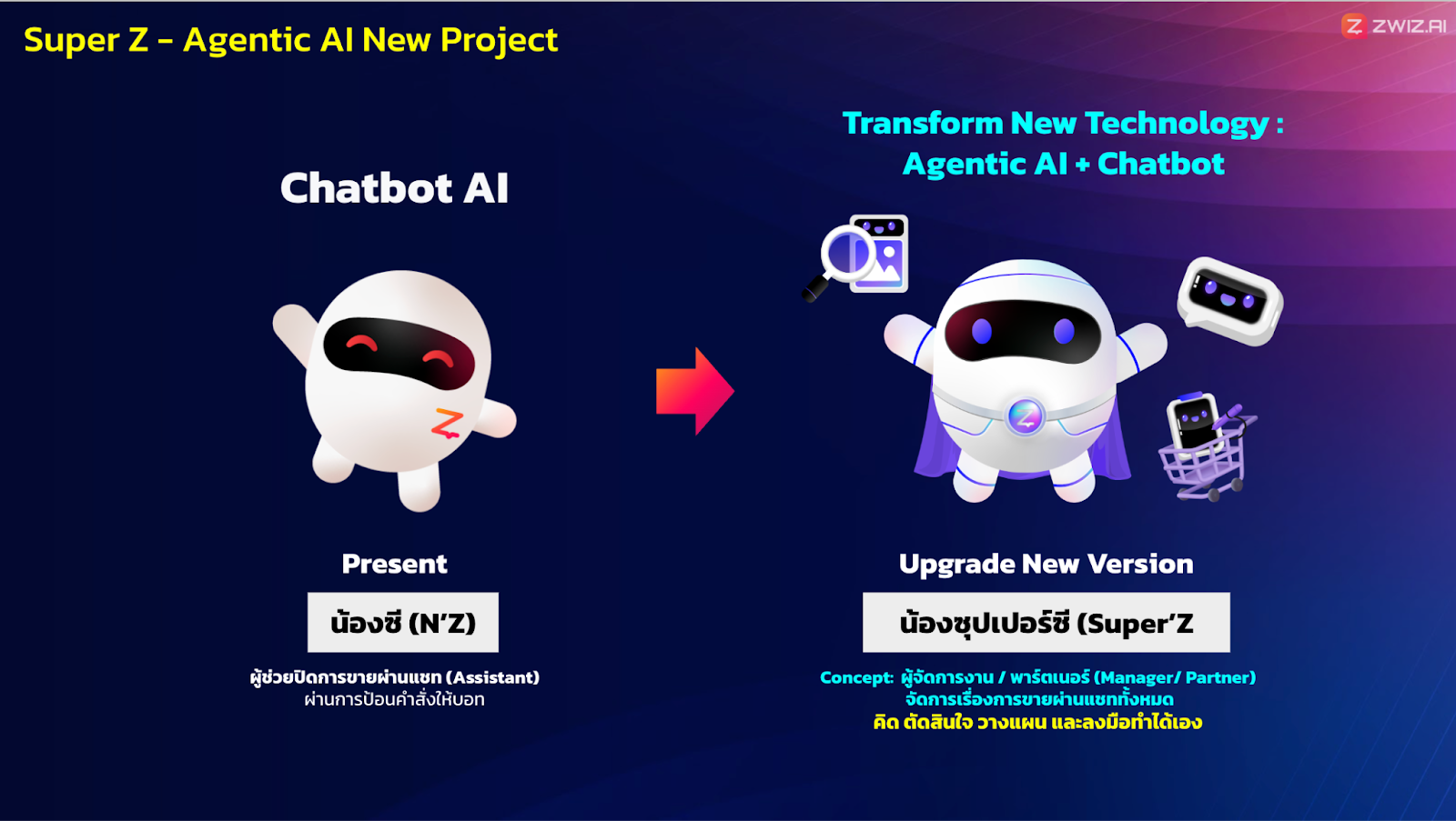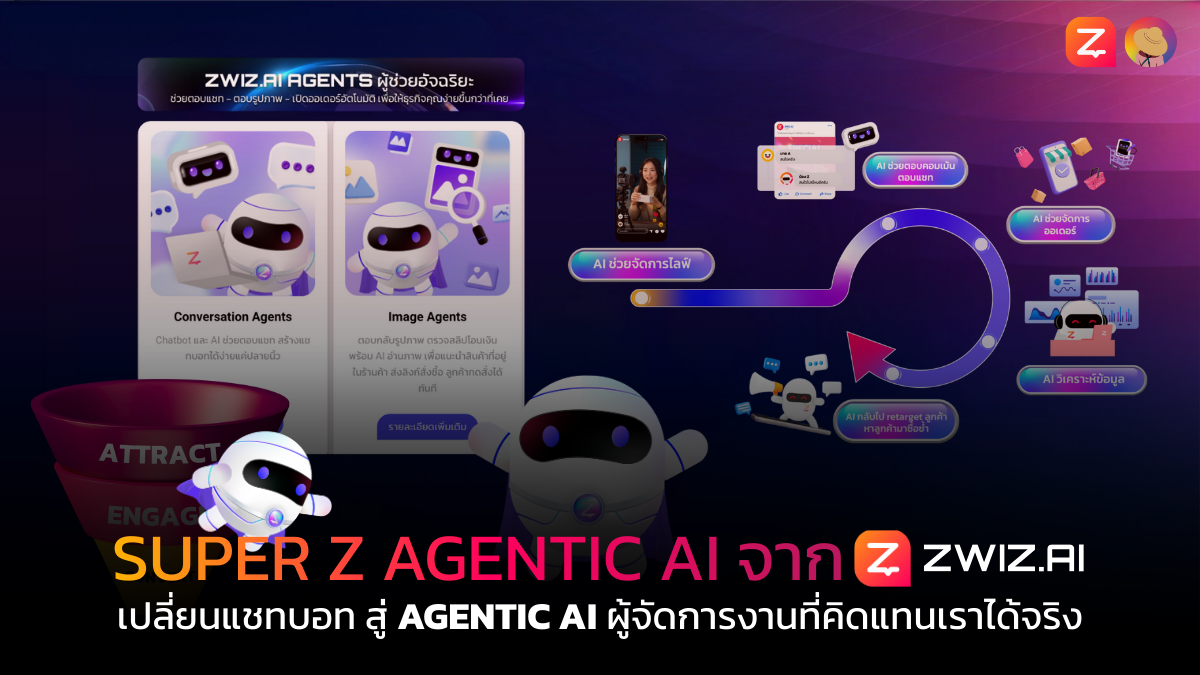 นี่จึงเป็นแรงบันดาลใจที่ทำให้ ZWIZ.AI พัฒนา Chatbot ให้อัพเกรดขึ้นสุดเป็น Super Z Agentic AI เพื่อช่วยให้ปิดการขายได้ไวมากขึ้นหลายเท่า พร้อมแนวคิดต่อยอดจาก Chatbot เดิม ที่เป็นมากกว่าผู้ช่วย ให้เป็นเพื่อนคู่คิดหรือทีมงานที่พร้อมช่วยให้ธุรกิจของคุณเติบโต ซึ่งตรงกับคอนเซปต์การทำงานของ Agentic AI ที่เป็นผู้จัดการงานและทำงานแบบอิสระไม่ต้องรอป้อนคำสั่งครับ