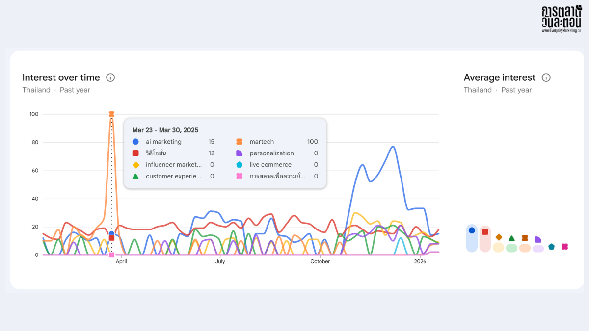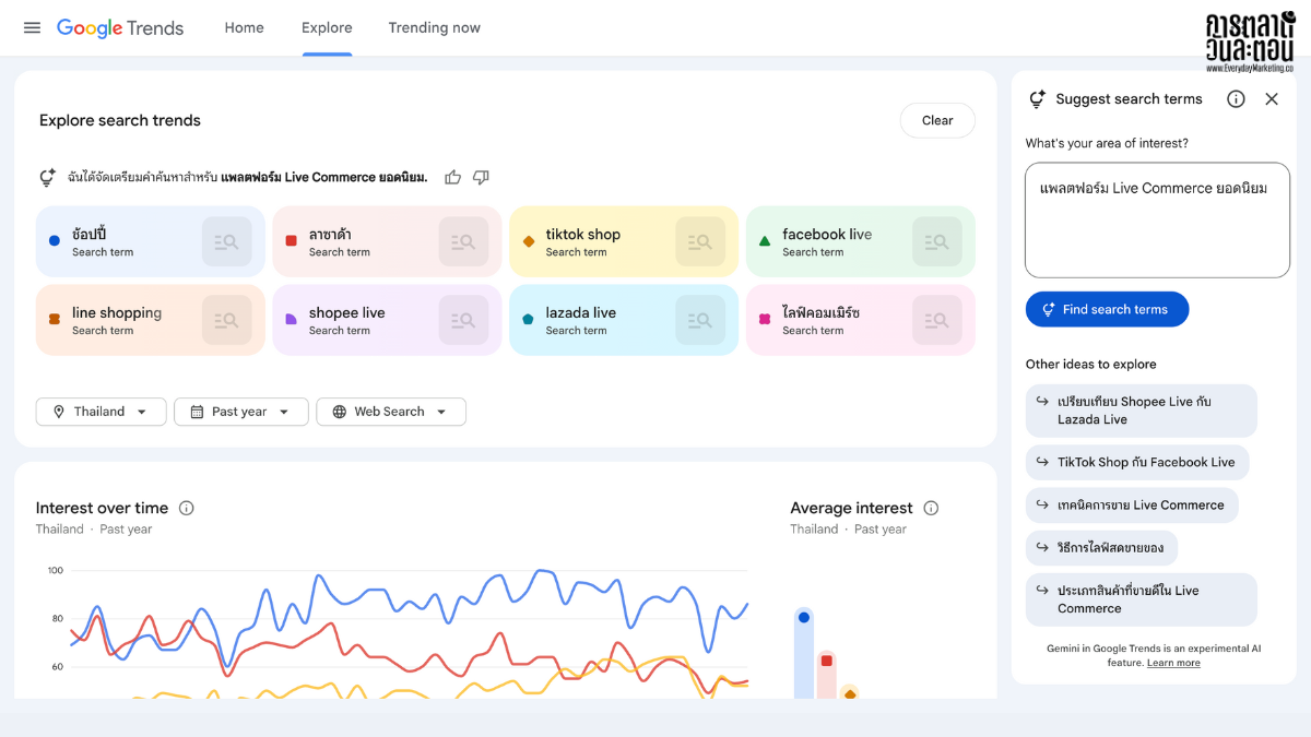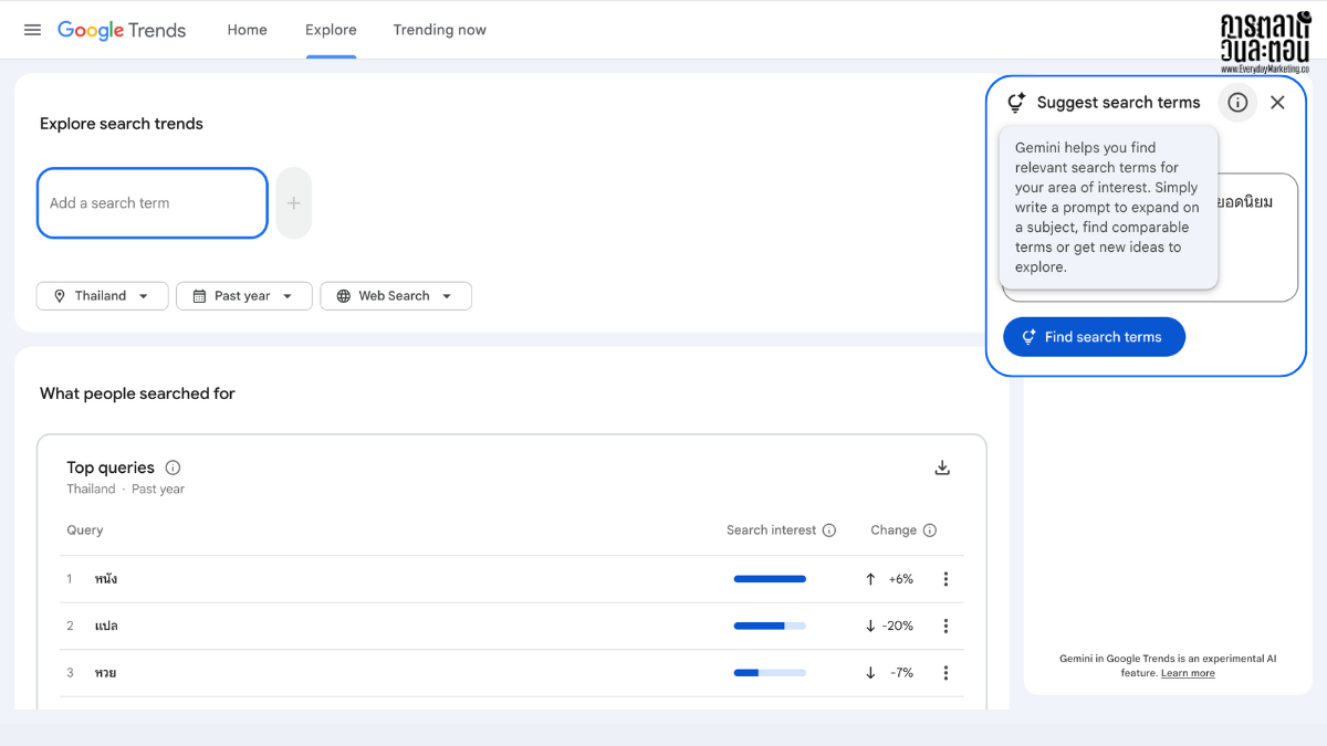 การกดใช้ Prompt เหล่านี้จะพาคุณวนเข้าสู่กระบวนการเดิมอีกครั้ง แต่ด้วยมุมที่เฉพาะและลึกขึ้น วิธีนี้เหมาะมากสำหรับคนที่ต้องทำ Research ต่อเนื่อง โดยไม่อยากเริ่มจากศูนย์ทุกครั้ง หลังจากได้ชุดคีย์เวิร์ดที่ Gemini แนะนำ Google Trends จะสร้างกราฟ Timeline ให้ทุกคำทันที ให้สังเกตว่าคำไหนพุ่งเป็นช่วง ๆ คำไหนคงที่ระยะยาว และคำไหนเริ่มโตในช่วงหลัง