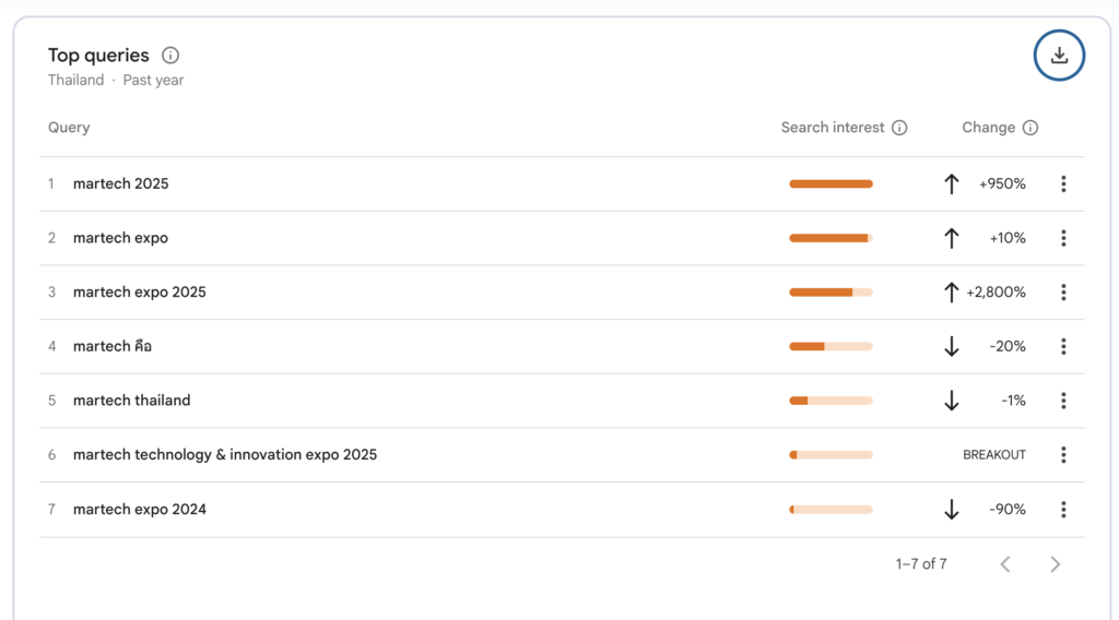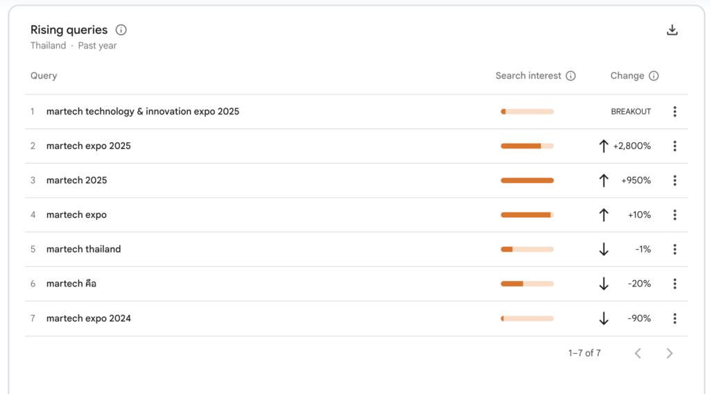 ต่อมา Google Trends จะนำคำเหล่านั้นไปแสดงผลในรูปแบบ Timeline, Top Queries และ Rising Queries เหมือนการใช้งาน Trends ปกติ จากนั้นเลื่อนลงไปดูส่วน Top Queries และ Rising Queries ซึ่งตอนนี้แสดงได้มากขึ้นถึง 50 คำ ทำให้เห็นคำรองและคำที่กำลังโตได้ชัดกว่าเดิมมาก ขั้นตอนนี้เหมาะกับการหาไอเดียคอนเทนต์ SEO, หัวข้อบทความ, หรือ Insight สำหรับแคมเปญ